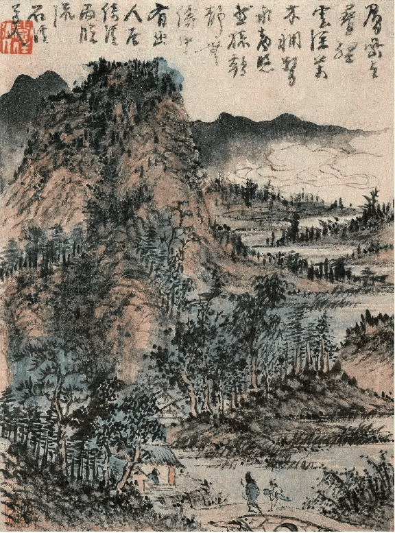 收藏于上海博物馆的这套山水册页,大多没有年款。有一叶题云:“癸卯秋九月过幽闲精舍,写此以志岁月,残道者。”可见整本册页应在是年(髡残五十二岁)前后完成。从风格判断,也应为成熟期的手笔。此幅虽然尺幅不大,但溪泉茅屋、层林峻峰、白云远岫繁复缜密,体现出髡残匠心之独运,用笔用色也趋老辣。