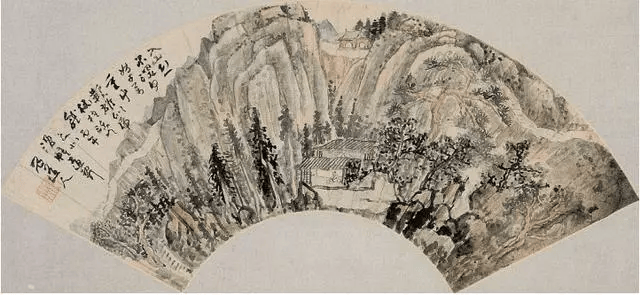 《山齐禅寂》扇面题诗云:“入山恐不深,何妨千万重。草鞋雄似虎,杖柱活如龙。”髡残一生好游名山大川,在学习传统的基础上,重视师法自然,自谓“论画精髓者,必多览书史。登山穷源,方能造意”。此画作山脚书屋与山巅寺宇的呼应,群山万千,山径隐现,颇伸壮游之志。这是髡残五十四岁时画给好友的。