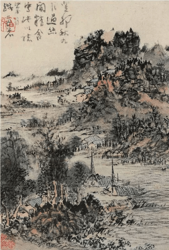 这是这本册页中两件有年款的画之一。考其时,癸卯当为康熙二年(1663),当时髡残己经五十二岁,定居于南京牛首山天阙山房。这是他自幽闲精舍访问归来忆写途中情景而作。画中可见河岸村舍,芦草船樯,对岸山中半隐佛家精舍。此画用笔苍浑,设色丰富统一,可见髡残最喜使用的朱膘、赭石与花青,又善于色墨互破,形成浑融一体不见端倪的艺术风貌。此在四僧中为特出者。