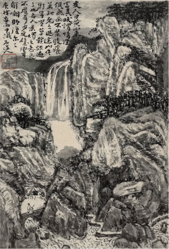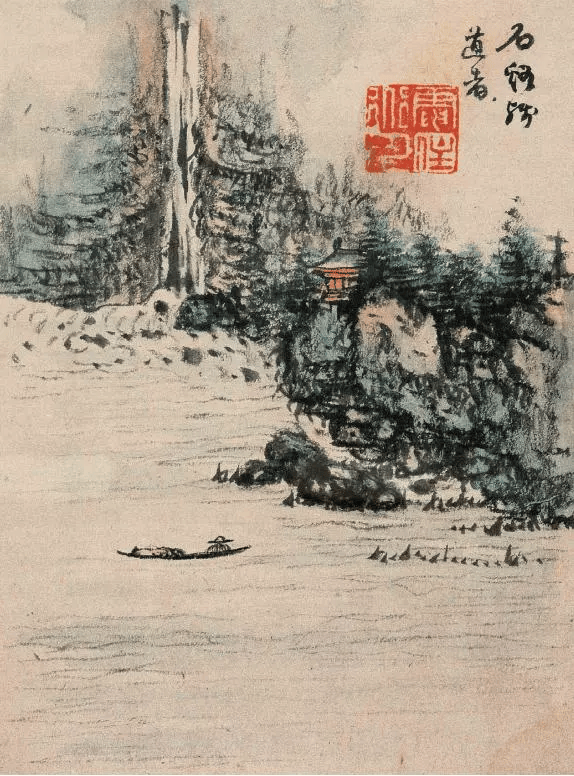 此画只落穷款“石溪残道者'画悬崖瀑布,楼阁半隐,蓑笠放舟之境。用笔依然荒率老辣,设色冷暖对比强烈,舟中人隐其面目,似是静听瀑布流水之声,颇有“鸟鸣山更幽”的意境。