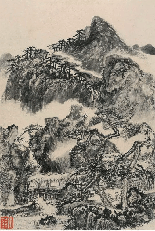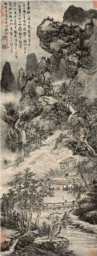 溪涧、山崖、高松、村落布置曲折多变,幽深莫测。从画风看,髡残与元王蒙最相接近,画面气势磅礴,纵横变化,离奇高妙,渴笔与焦墨则有“干裂秋风,润含春雨”之感。但髡残的山水画在构图上更见繁复,气韵苍浑,别有一种老辣、苍健的风范。此图最能体现髡残“奥境奇辟,缅缈幽深”的画风特点。