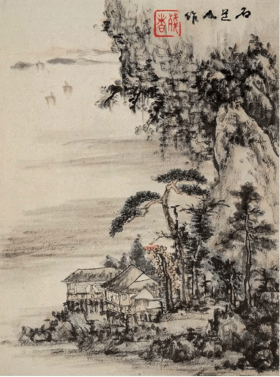 此册页写崖下水阁,正是红叶秋老时节,高松夭矫,巉岩嶙峋,远处帆影点点,横无际涯。用笔益见荒率,焦墨干笔皴擦兼施,使画面产生苍茫凝重感,亦为髡残独到之处。