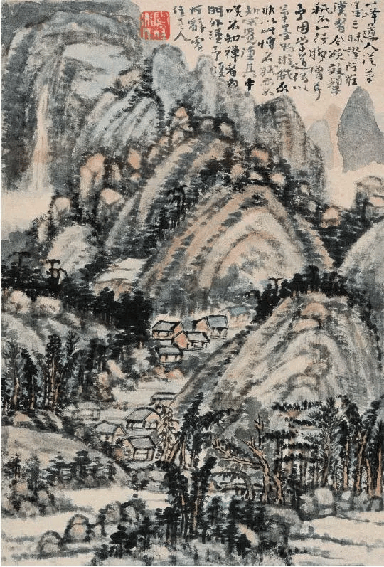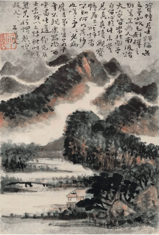 此画为模仿宋米海岳之作,又以己意为之。尤其在设色上冷暖色强烈对比,使作品在混茫中透出绚烂之气。这又是髡残强烈的个人风貌。此幅在色墨繁复破染中山色益见浑厚,正所谓“浑厚华滋”是也。