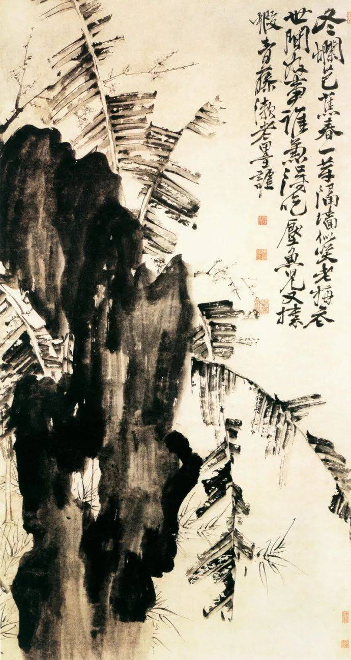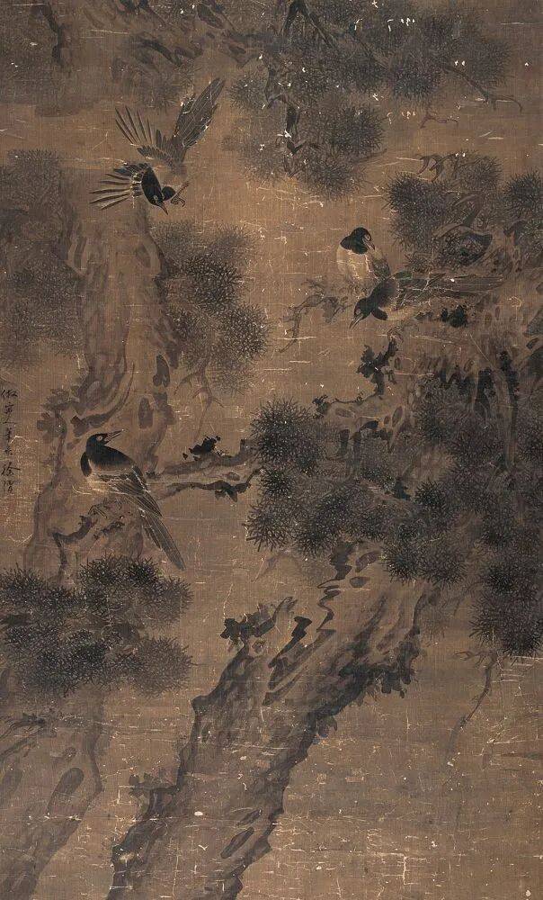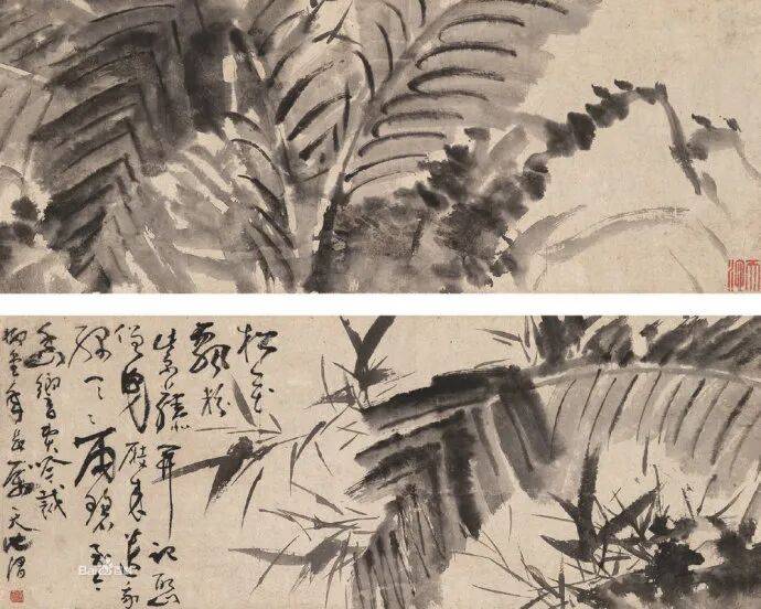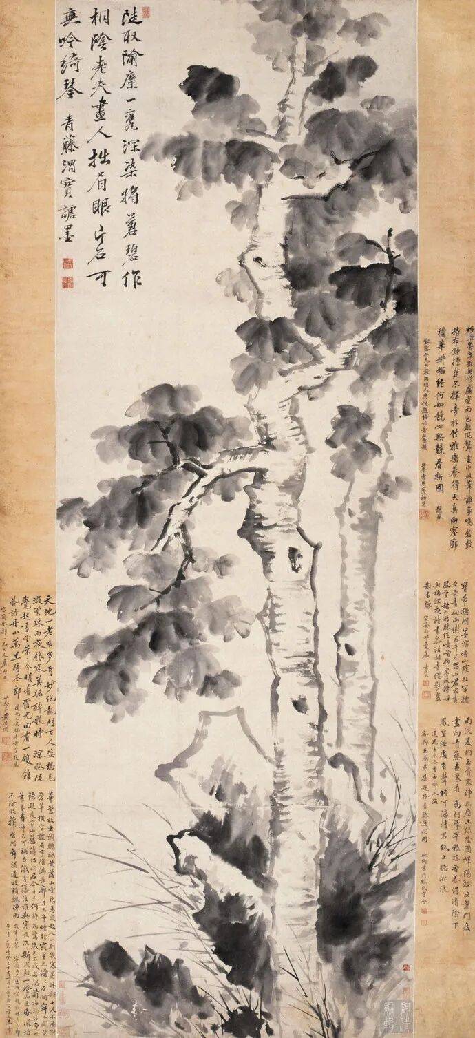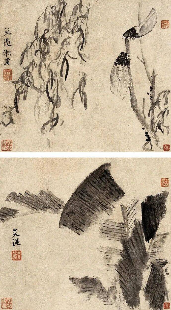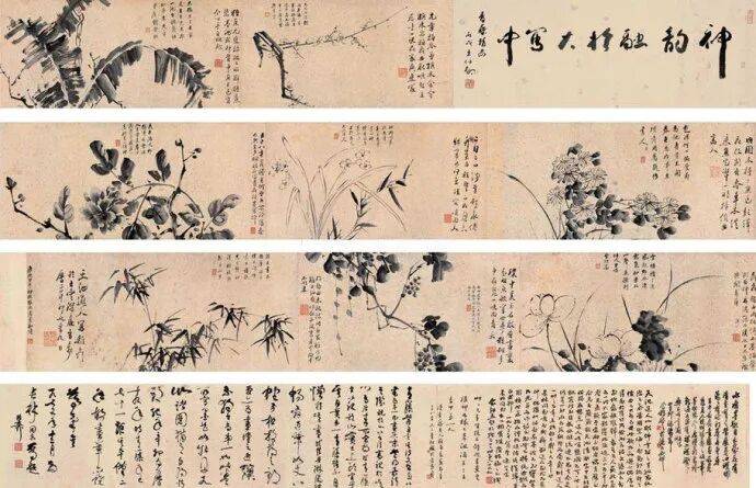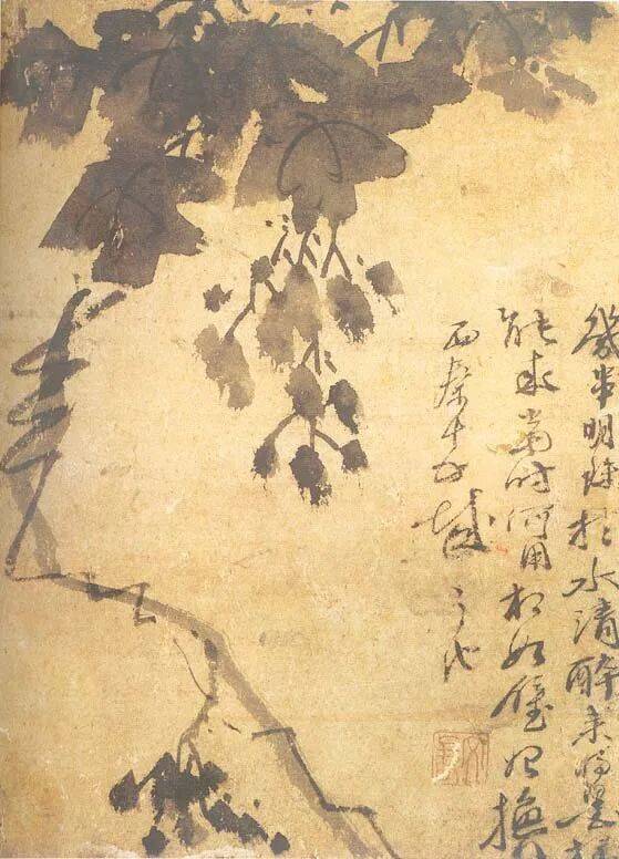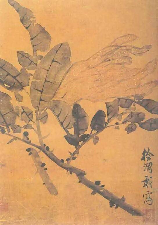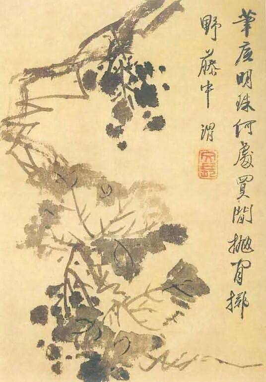 徐渭中年以后开始学画,擅长画花鸟,兼能山水、人物、水墨写意,气势纵横奔放。特长于水墨大写意花卉,工画残菊败荷,炉瓶彝鼎,皆古朴淡雅,别有风致。现藏南京博物院《杂花院》,全画有牡丹、紫薇、葡萄、芭蕉、梅花水仙和竹等13种。情意所至,气势豪放。发挥了高度的艺术技巧。“无法中有法”、“乱而不乱”,表现出画家深厚的功力。在四百年后的今天,仍给人以笔墨淋漓,赏心悦目之感。徐渭所绘山水,纵横不拒绳墨,所绘人物尤其生动。史载“醉后专捡败笔处拟试桐美人, 以笔染两颊,丰姿绝代。转觉世间胭粉如垢尘,不及他妙笔生花。”他的作品不拘于物象,能抓住其神气,用秃笔铺张,势如急风骤雨,纵横脾睨。他的大写意泼墨之势, 继陈道复以后,更加狂纵,笔简意浓,形象生动,影响深远。开启了明清以来水墨写 意法的新途径。清代朱耷、原济、扬州八怪中李(善)、李方膺都受其影响。数百年来势头未衰。