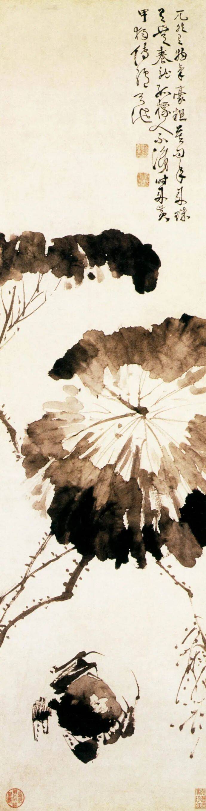 在作品中,徐渭经常题诗题句,借题发挥,抒写对世事的愤懑,所表现的思想政治倾向多比较激烈。如他题《螃蟹图》云:“稻熟江村蟹正肥,双螯如戟挺青泥,若教纸上翻身看,应见团团董卓脐。”这正是对权贵的憎恨与轻蔑。徐渭亦工书法,行书效仿米氏,笔意奔放如其诗,苍劲中姿媚跃出,不论书法而论书神。“诚八法之散圣,字林之侠客也。”近代艺术大师齐白石在提到徐渭时曾说:“恨不生三百年前,为青藤磨墨理纸。”这足以说明徐渭绘画对后人影响之深。