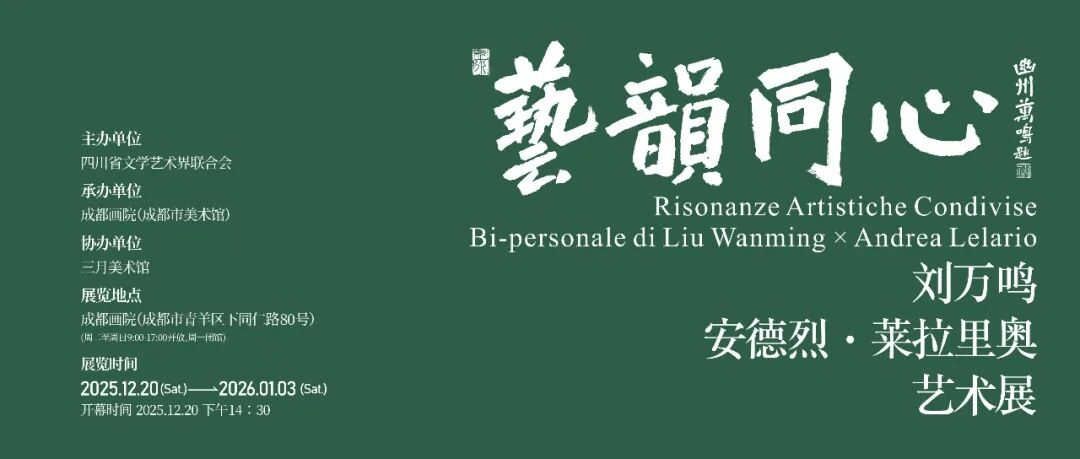 12月20日,“艺韵同心——刘万鸣、安德烈·莱拉里奥艺术展”在成都画院(成都市美术馆)开幕。本次展览由四川省文学艺术界联合会主办,成都画院(成都市美术馆)承办,三月美术馆协办,中国文化艺术发展促进会副主席曾来德担任策展人。展览展出中国国家画院院长、中国美术家协会副主席刘万鸣的77件作品,意大利罗马美术学院原院长、版画家安德烈·莱拉里奥的22件(组)作品。