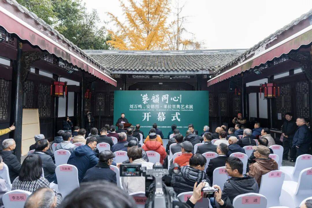 展览开幕式上,原文化部党组副书记、副部长赵少华宣布展览开幕。刘万鸣,安德烈·莱拉里奥,四川省文学艺术界联合会主席陈智林,四川省文学艺术界联合会原副主席、成都艺术职业大学创始人余开元,四川省美术家协会主席李青稞,恒祥基业集团董事长、北京市工商业联合会副会长李明,中国艺术科技研究所学术委员会主任、丝路规划研究中心副理事长尹毅,中国国家画院书法篆刻所副所长(主持工作)谢小铨致辞。刘万鸣向成都画院(成都市美术馆)捐赠作品,成都画院(成都市美术馆)党支部书记杨晓泉向刘万鸣颁发收藏证书。展览开幕式由曾来德主持。