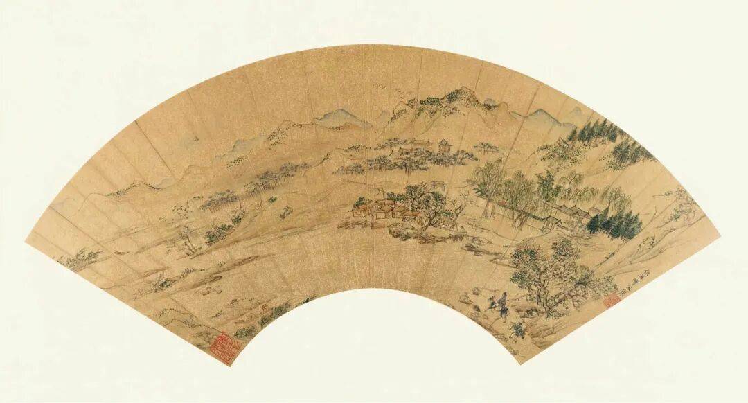 上面这幅《春郊行旅图》小品,于小小一方扇面中,取景广阔,描绘了一场盛大的春日江山风光。山水、人物、楼台、草树皆有描绘,景物繁多,设色丰富,流露出勃勃生机,而不失清新雅致。