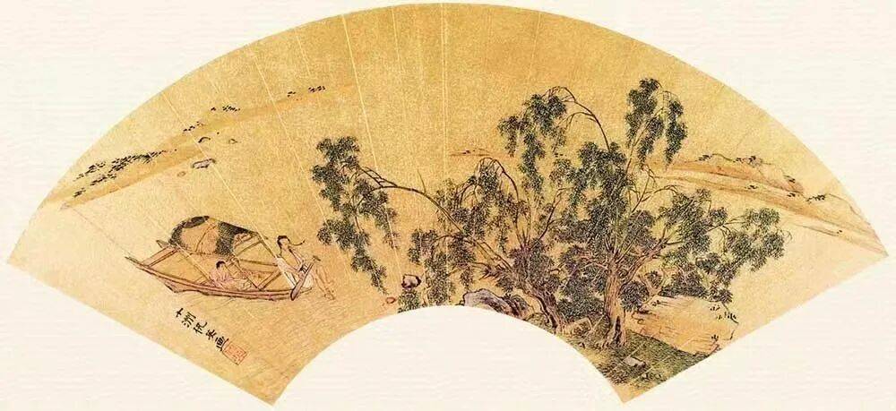 上面这幅《山水人物图》,扇面构图更是简明:左上角和右下角的绿树枝叶,呈对角线对称结构,对画面起着平衡作用。中间大面积是水面,水波粼粼,十分平静。湖上小舟静静漂浮,渔人坐于舟上,吹笛为乐。整图富有闲情逸致,有浓厚的文人色彩。