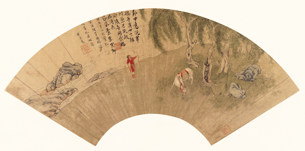 上面这幅《解马弯弓图》扇中,溪水之畔,柳树成荫。树旁白马低头吃草,马的主人身着红衣,手执弯弓,貌似刚刚射出一箭。马鞍和人的衣服,色泽鲜艳,柳枝垂下,绿色蒙茸。马匹、人物的状态都比较悠闲。