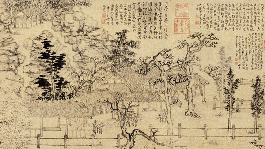 苏州伟大的庭园多兴建于元明两代,而且,如今大多还能见到。对于苏州的诗人和画家而言,庭园不仅是他们画作的背景,同时也是最好且最典型的作画题材。在这些私人的庭园之中,所有残酷或令人不快的事都可一扫而空,而且,画家也可以很轻松地将庭园中的种种逸乐,转化为具有相同特色与目的的画作。如果说,绘画仿佛是对真实庭园作一种平面的描绘,那么,庭园无疑也是画中世界与画中理想的一种立体呈现,它介于艺术与现实生活之间。就跟藤原时代的日本一样,十六世纪初期的苏州社会,或是其特权阶级,在经过成功地经营之后,人们仿佛都过着如诗如画的生活,这种现象在人类历史上是很少见的。庭园正好处于真实与美感之间的模糊地带。而且,庭园也像艺术品一样,可以贯穿过去和现在,因为它可以屹立好几百年之久(诗人或画家可以在倪瓒和赵原所曾经描画过的庭园“狮子林”之中,应景作诗或是绘作册页),同时,以往的文献或绘画所记载的古代庭园,后人也可以通过实际的建筑(或是揣测),加以重现。