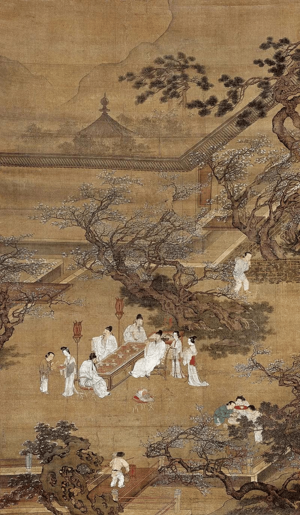 仇英有两件描写庭园人物的大幅落款杰作,现属日本京都的佛寺知恩院收藏。这两件作品都是描绘历史上的名园。