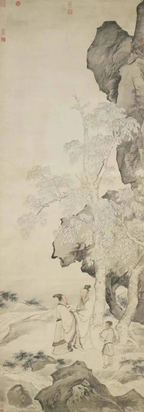 我们所刊印的是这套四季山水的春景部分,题为《桐阴清话》。画中有两位人士站在巨石旁边的阔叶梧桐树下,旁边湍急的水流是画面季节的主要提示。在这套描绘四季的画轴当中,另外还有一幅夏景山水传世,名为《蕉阴结夏》。《桐阴清话》轴中站立的人物的服饰及其稳重的姿态,与唐寅《高士图》的高士并无不同;而这两幅画的基本差异在于:仇英对人物的描绘十分严肃,就跟他处理所有题材的作风一般。这两名高士慎重地执手相对,宛如刚刚相遇或即将分别;两人的表情都很平静。湍急的溪流和岩石应和了人物的主题,暗示了时光流逝以及历久不衰,这两者都是他们之间友谊的写照;湍溪、树木以及岩石下方阴影所围绕的部分,产生了树荫下闲话家常的气氛,反而,人物本身并无此效果。仇英与同代的文人画家不同,他在处理这种高大的构图时,不会刻意做成狭长的立轴,也不会堆砌情节;也因此,画的焦点得以维持,结构也很清朗。细观此轴,再与仇英其他作品相较,《桐阴清话》的处理显得流畅,甚至非常活泼;再者,仇英刻画人物所用的笔法紧劲而有弹性,岩石的轮廓则以叉笔勾勒而成。