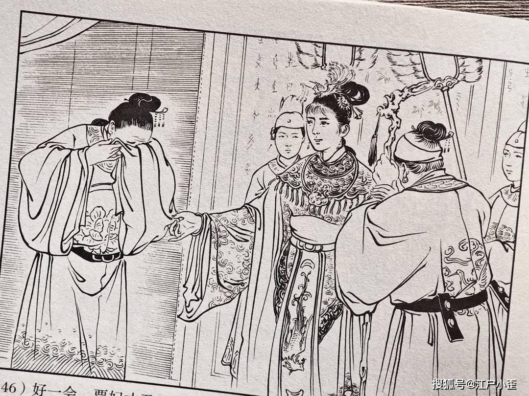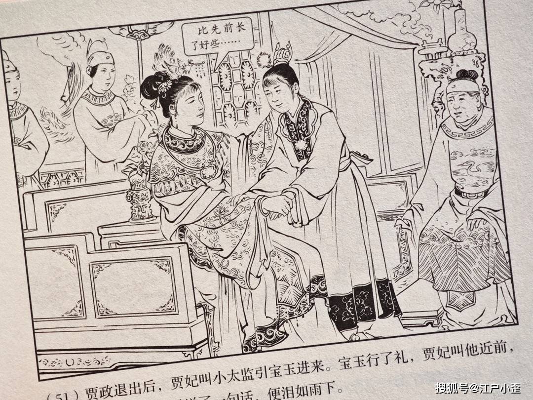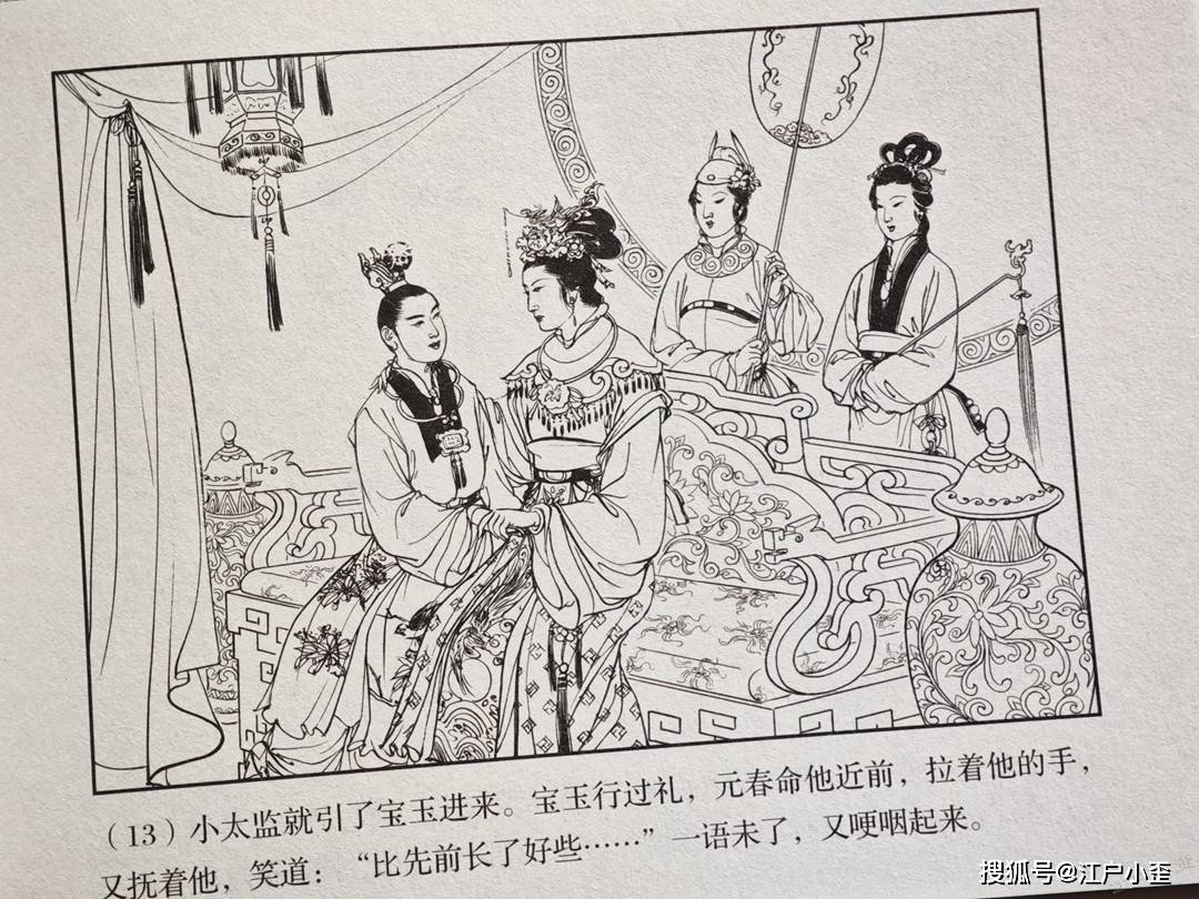 封面是胡若佛执笔,那时候他还署名胡丁文。画面中贵妃元春回家省亲,与贾母,王夫人相见,元春虽富贵已极,但深宫孤寂,不能享人间天伦之乐,此刻忍不住流泪,宝玉在帘幕后窥探,很有偷感。值得吐槽的是,太监跪拜的角度不太符合透视,元春的云肩常见于戏曲服饰,看起来民俗而不高贵了,元春为什么还会有一个金玉锁,比宝玉的那只小。