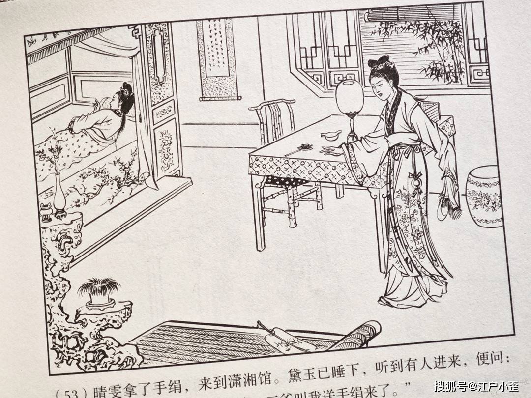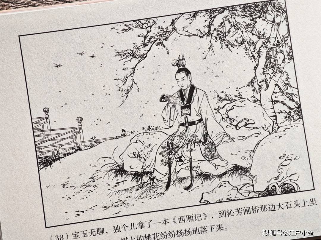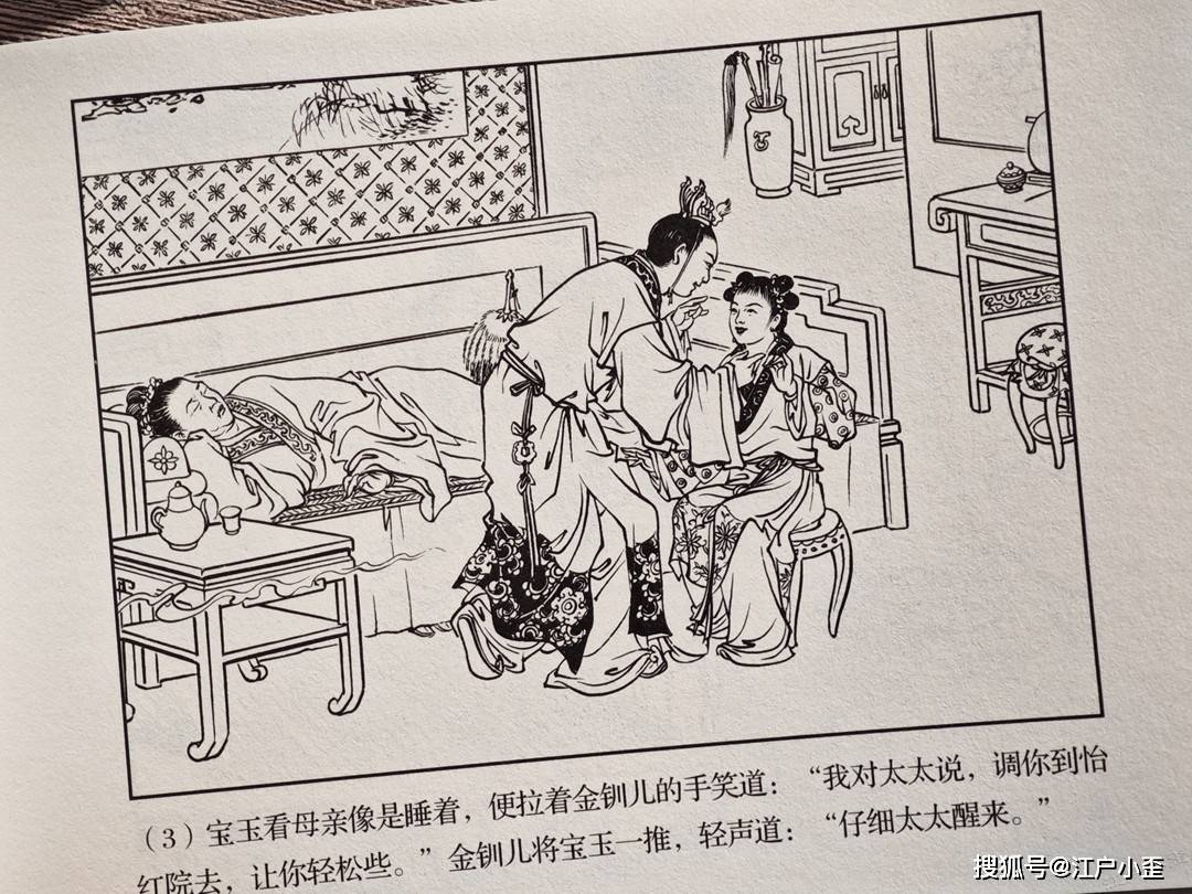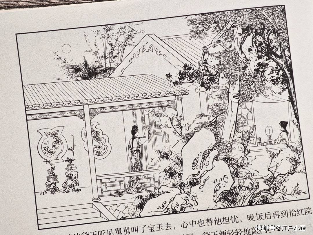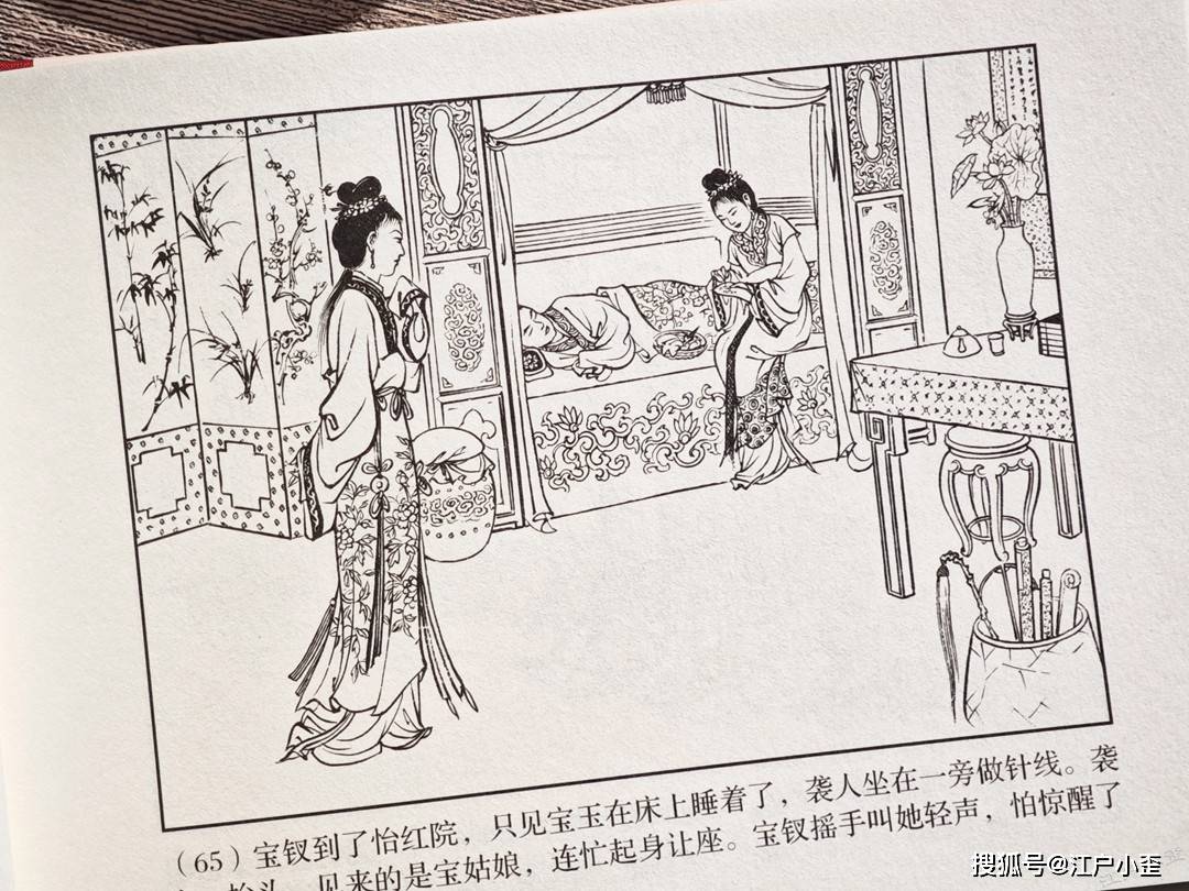 红楼梦的连环画不好编,更不好画,因为红楼表层故事“假语存”不过是闺阁闲情琐事,几乎全是文戏,极少有激烈冲突战斗等,缺乏舞台展示效果,至于小说深层次含义“真事隐”,要靠连环画去表现很难,插图组画类或许有更多发挥空间。用传统写实的白描去画红楼,很容易陷入场景人物雷同的赘述感。