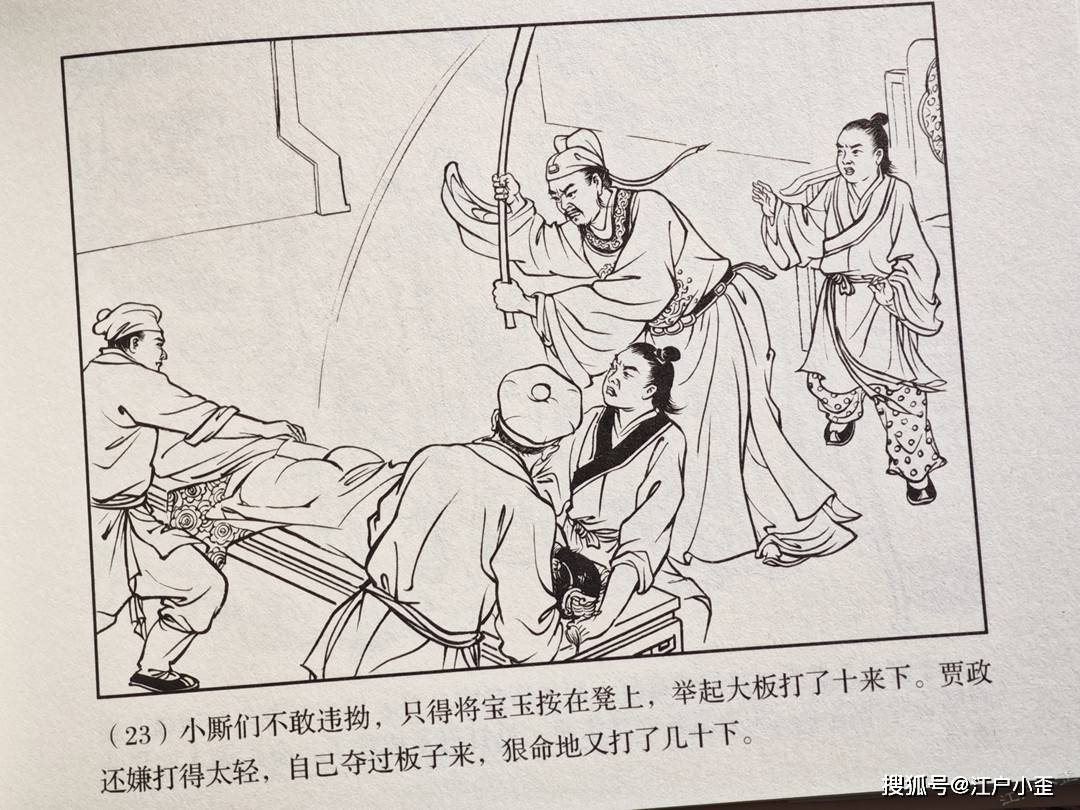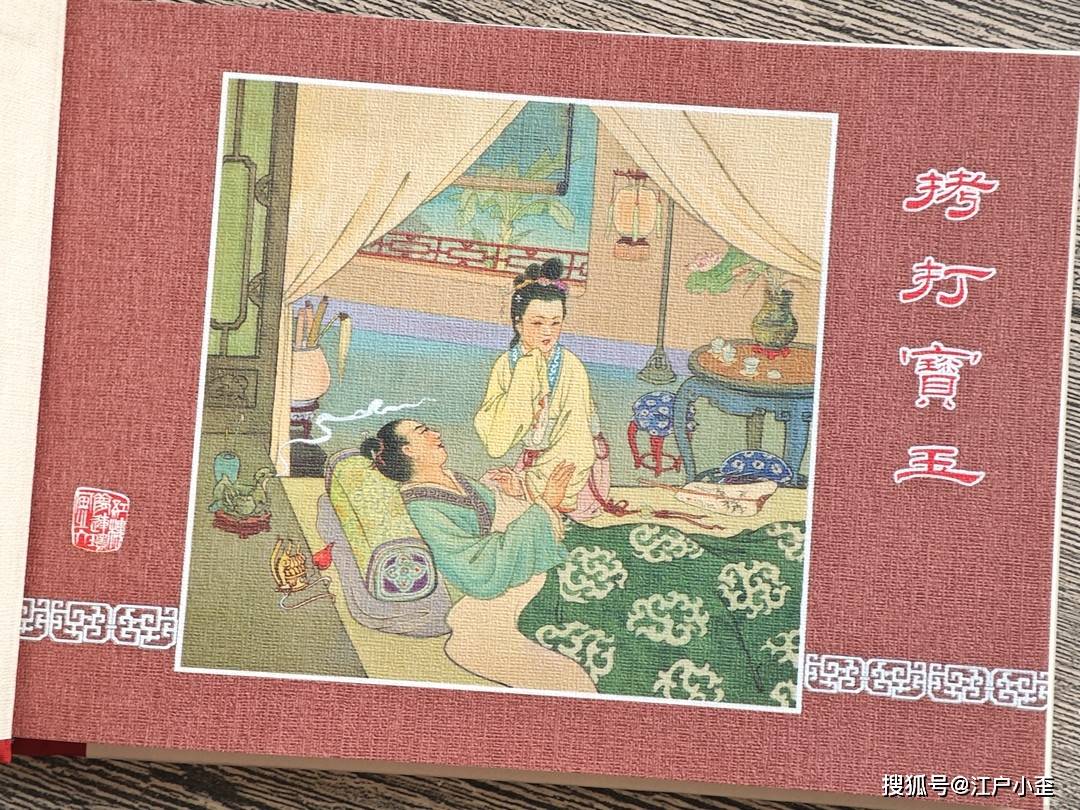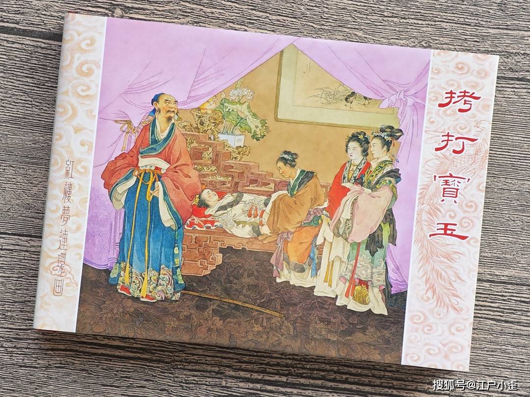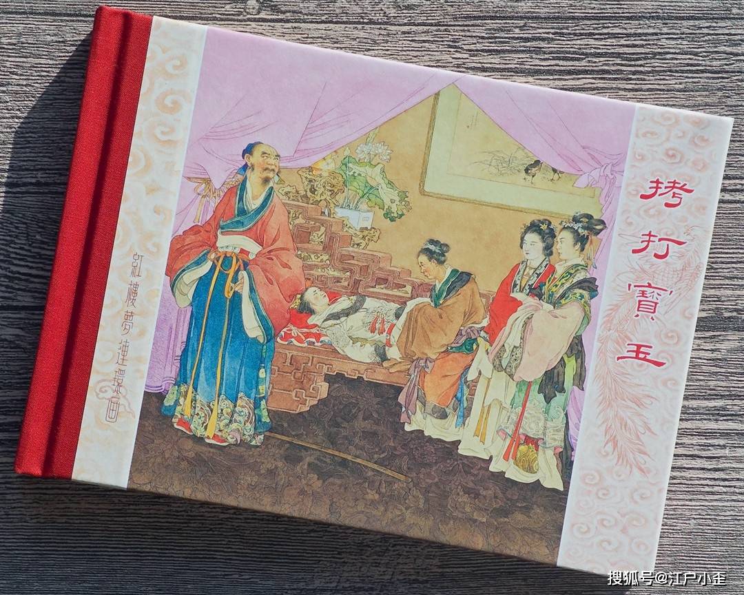 拷打宝玉封面不是董天野,经过查考发现是杨俊生绘。杨俊生一般是负责年画的,带有民国擦笔水彩风格,纯粉的幔帐,深色荷花池纹样的地板,都让这个画面透出不一般,贾政生气地背身站,他刚狠狠打了宝玉,因王夫人舍命苦劝,他没法继续教训这个不孝之子。人物面部和一般连环画也不同,可能还融合了明清人物画、日本浮世绘的一些特征。王夫人旁边两位女眷,我猜测是凤姐和李纨,红衣是凤姐,个高的是李纨,原著有说明当时她们在场。这幅画怎么看怎么诡异,在整套书中显得格格不入。