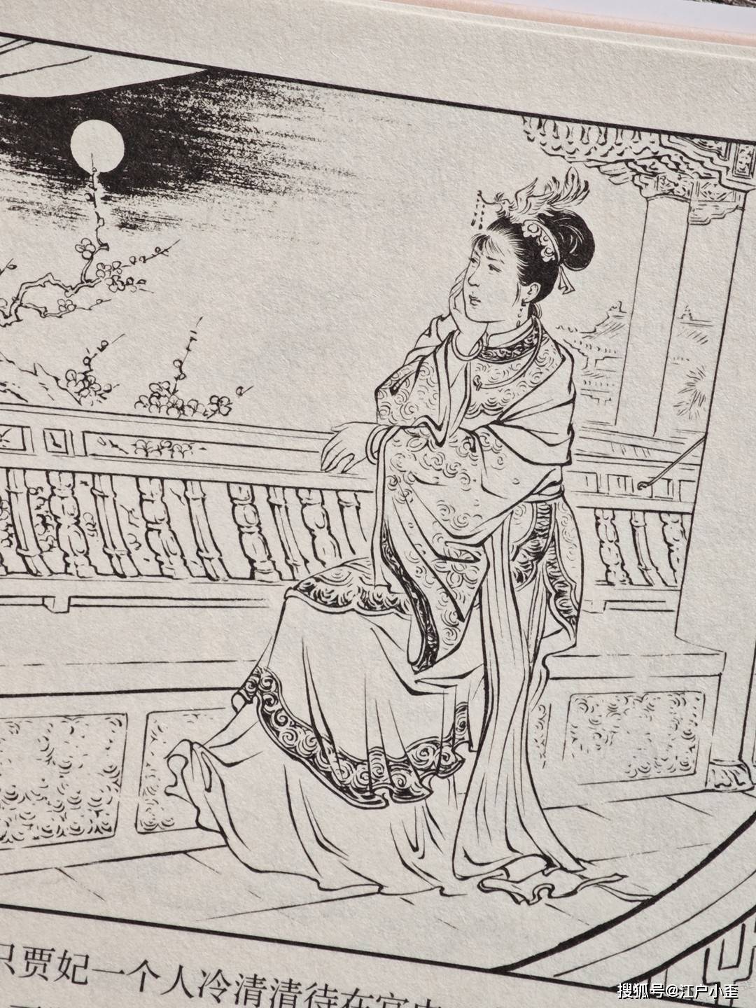府里欢庆饮宴,觥筹交错,而元春在冷清的皇宫大内倚着栏杆愁思,画面不用塞太满,看眼神、明月、梅花,她的心情自然显现。