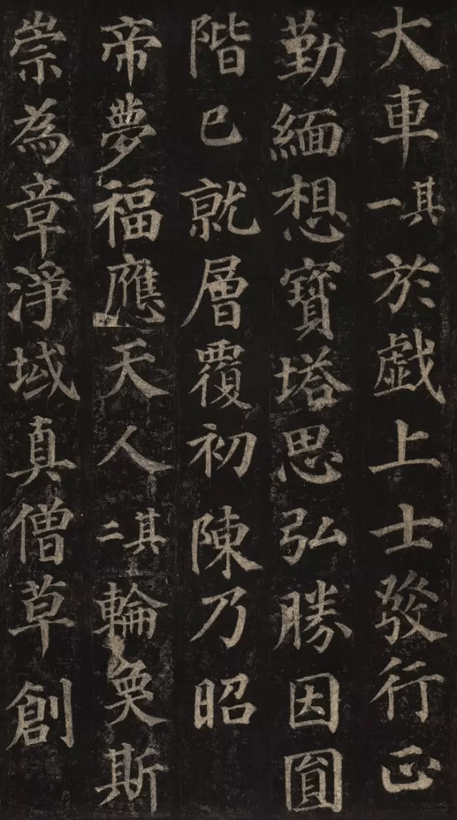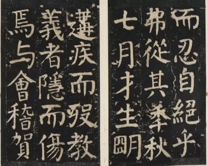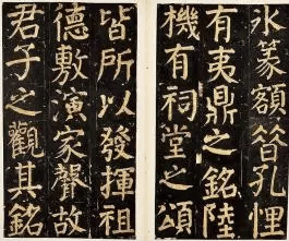 在结体上, 颜真卿的宇雄秀端庄,浑厚强劲,四周形密,中宫宽阔,没有重心欹侧、左紧右松的特点, 像篆书和隶书一样对称。在布白上,行间紧密,字间栉比,其气势通过形密充分表现出来。