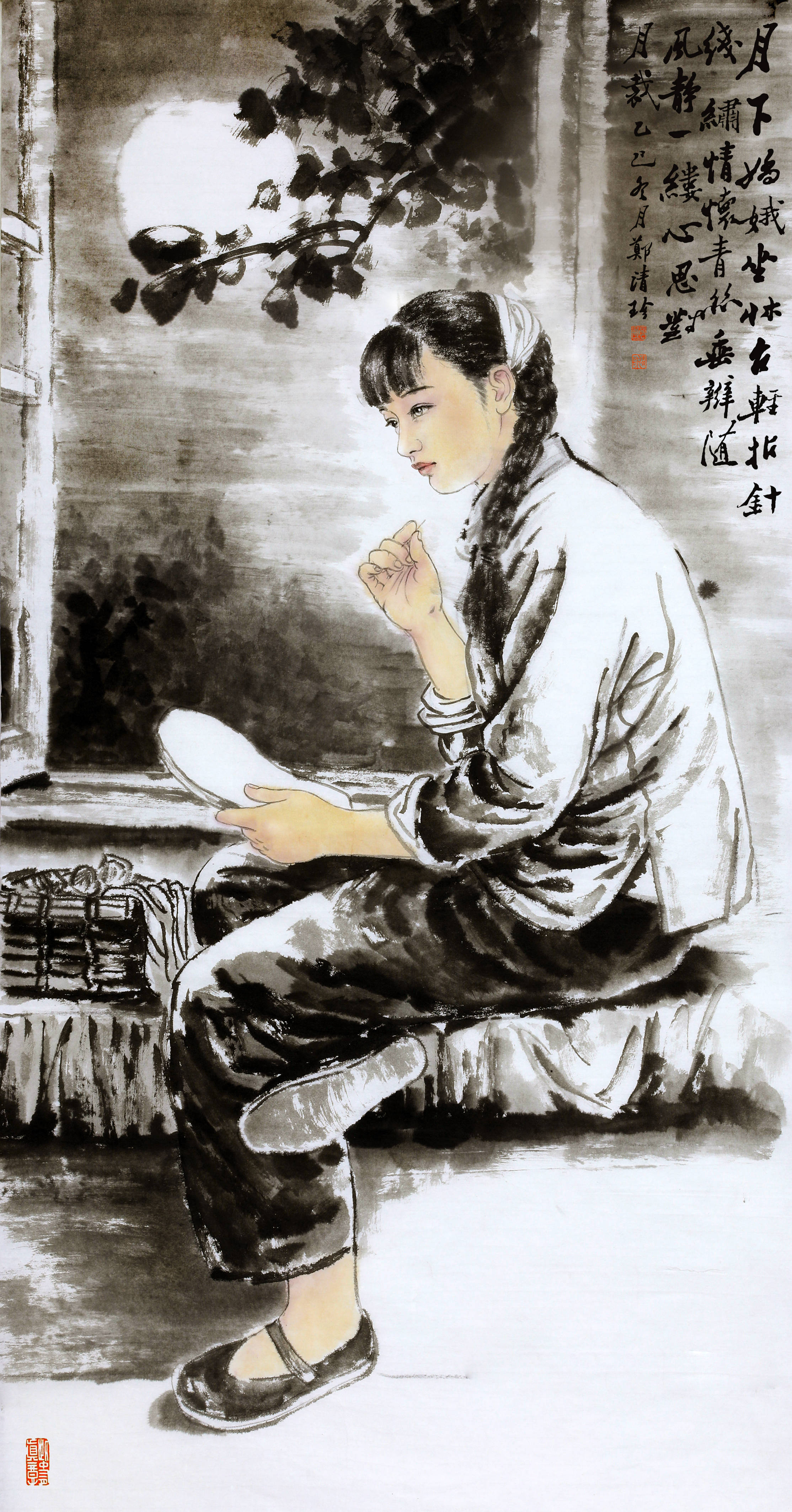 月下纳鞋的女子更见功力,昏黄月色以淡墨铺陈,衣褶墨色沉郁却不失层次,指尖捻线的姿态精准传神,眉眼间的软和暖意透过笔墨溢出,题诗“线缕情愫”的缱绻之意,随针脚一同藏进了画面的细节里。