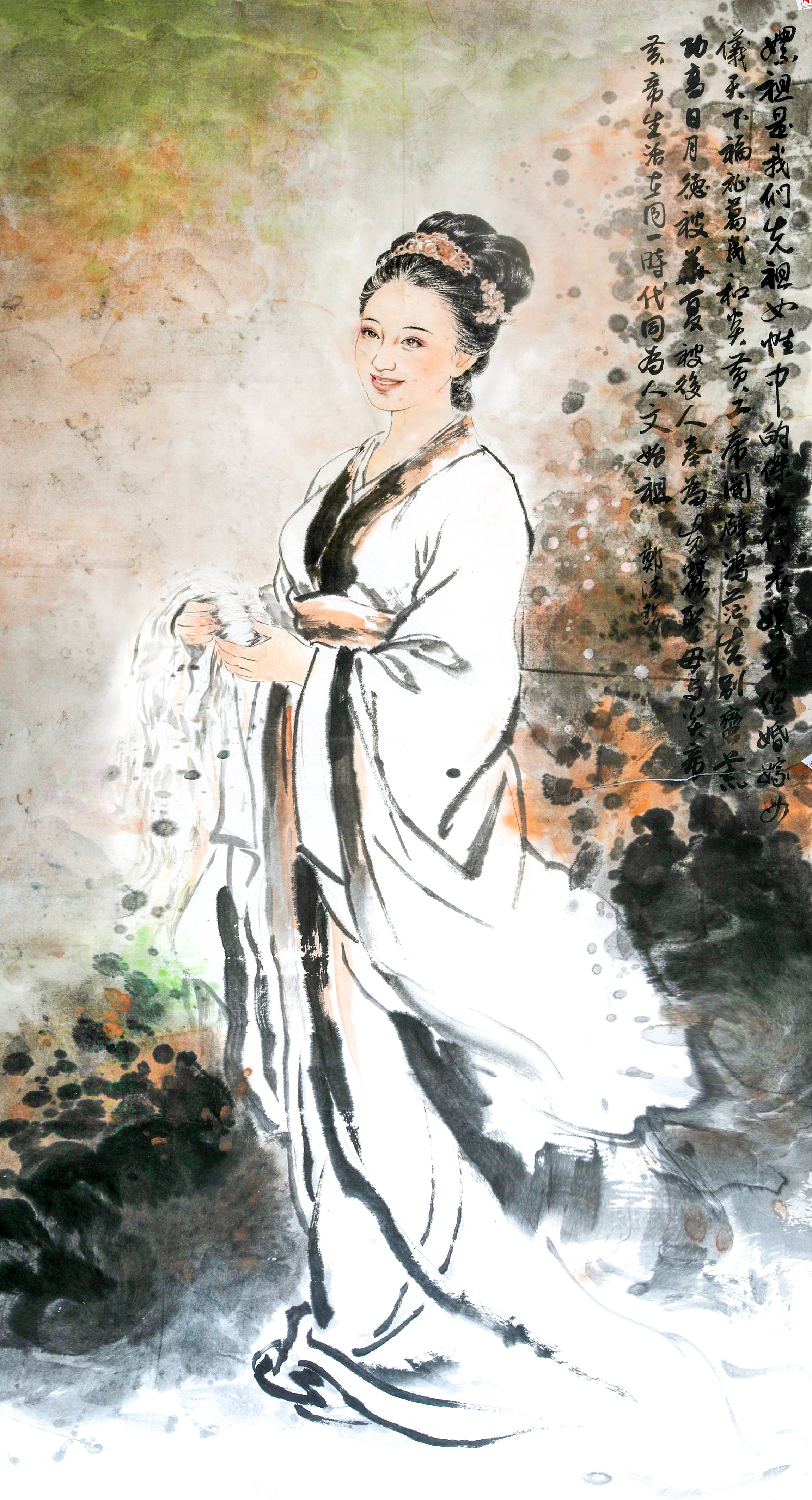 郑清珍的笔墨语言极具辨识度,讲究“墨分五色”的层次感,又摒弃了传统工笔的繁复堆砌,以写意笔触捕捉人物神韵。第一幅《嫘祖授丝》中,他以沉厚温润的墨色勾勒宽袖汉服的衣褶,线条遒劲却不僵硬,既凸显上古人文始祖的端庄气度,又以淡墨轻染眉眼,让“蚕神”褪去神话的疏离感,多了几分亲和笑意。题字的笔墨苍劲与人物衣袂的柔缓形成对比,将传统文人画的笔墨意趣与主题表达完美融合,尽显其对笔墨张力的精准把控。