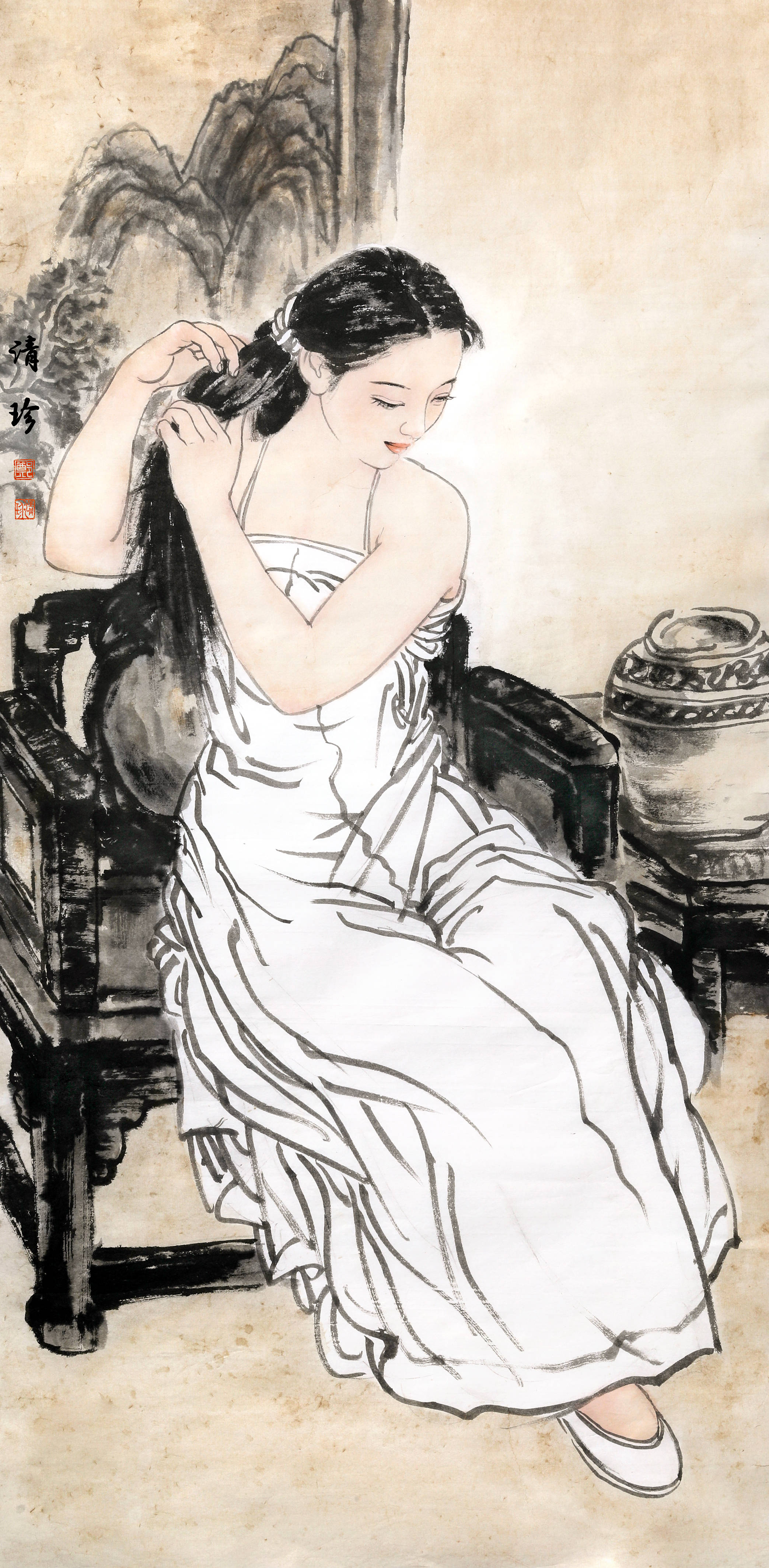 古今题材的自如切换,是郑清珍艺术风格的另一大特色。他以水墨为纽带,打破时空界限,让上古与现代、乡野与闺阁的女性形象在画中共生。