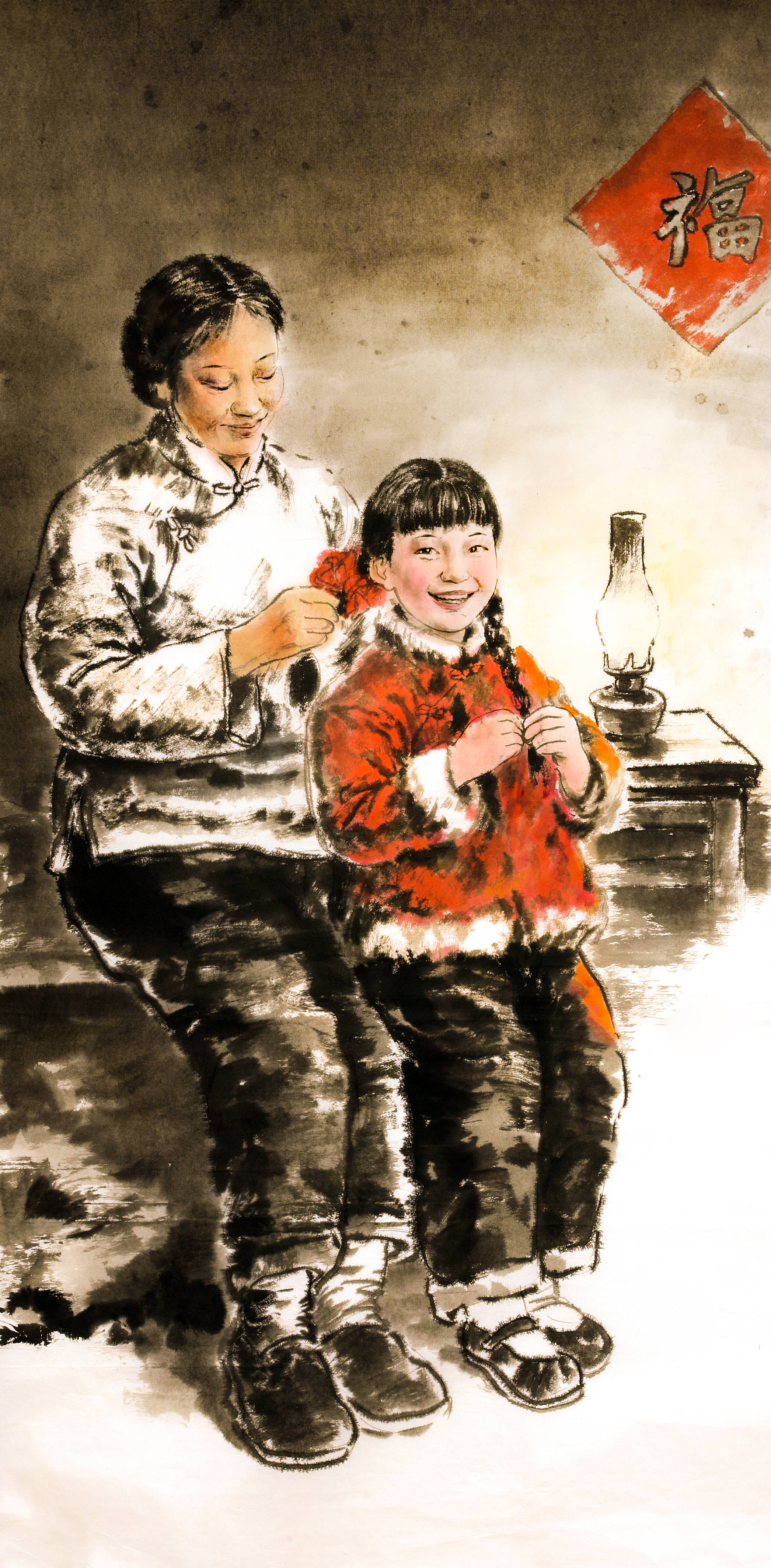 烟火气与雅致感的平衡,更让其作品兼具观赏性与感染力。暖光中给女儿梳辫的母亲,以朴拙的墨色勾勒衣纹,红“福”字的亮色点缀画面,女儿笑出的梨涡、母亲轻拢发梢的温柔,满是寻常家庭的暖意,笔墨间的烟火气直抵人心;