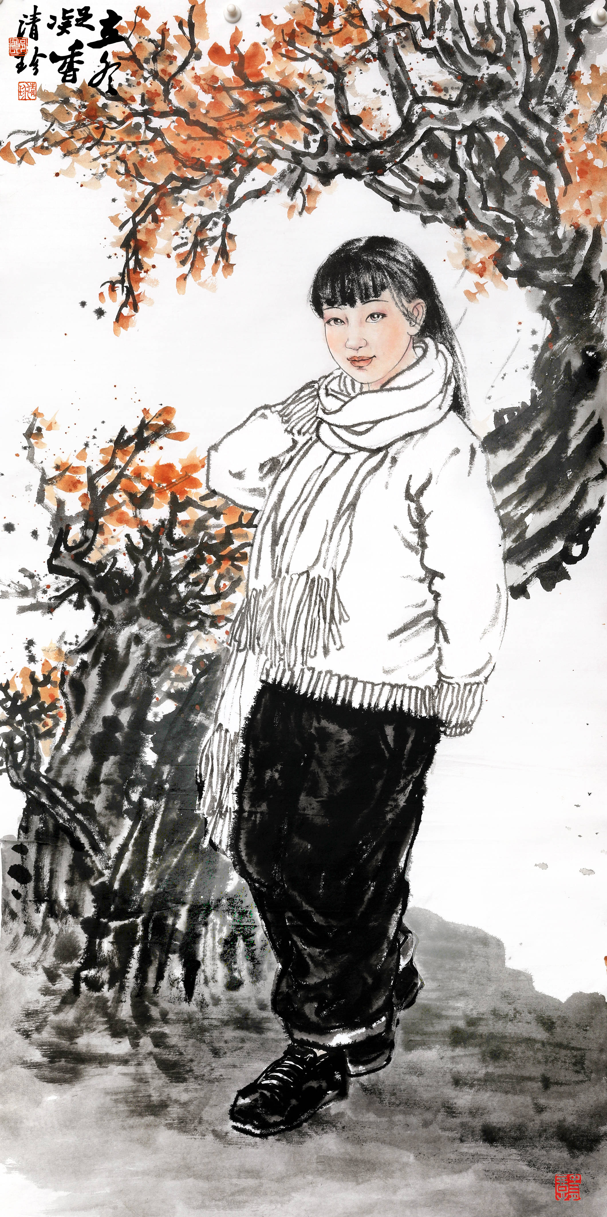 而梅树下的仕女则承袭古典意蕴,粉衫白裙倚着疏朗梅枝,指尖抵腮的姿态、眼尾的轻愁,皆透着传统仕女画的雅致,墨色梅枝与人物神情相互映衬,将古典闺怨的含蓄之美诠释得淋漓尽致。