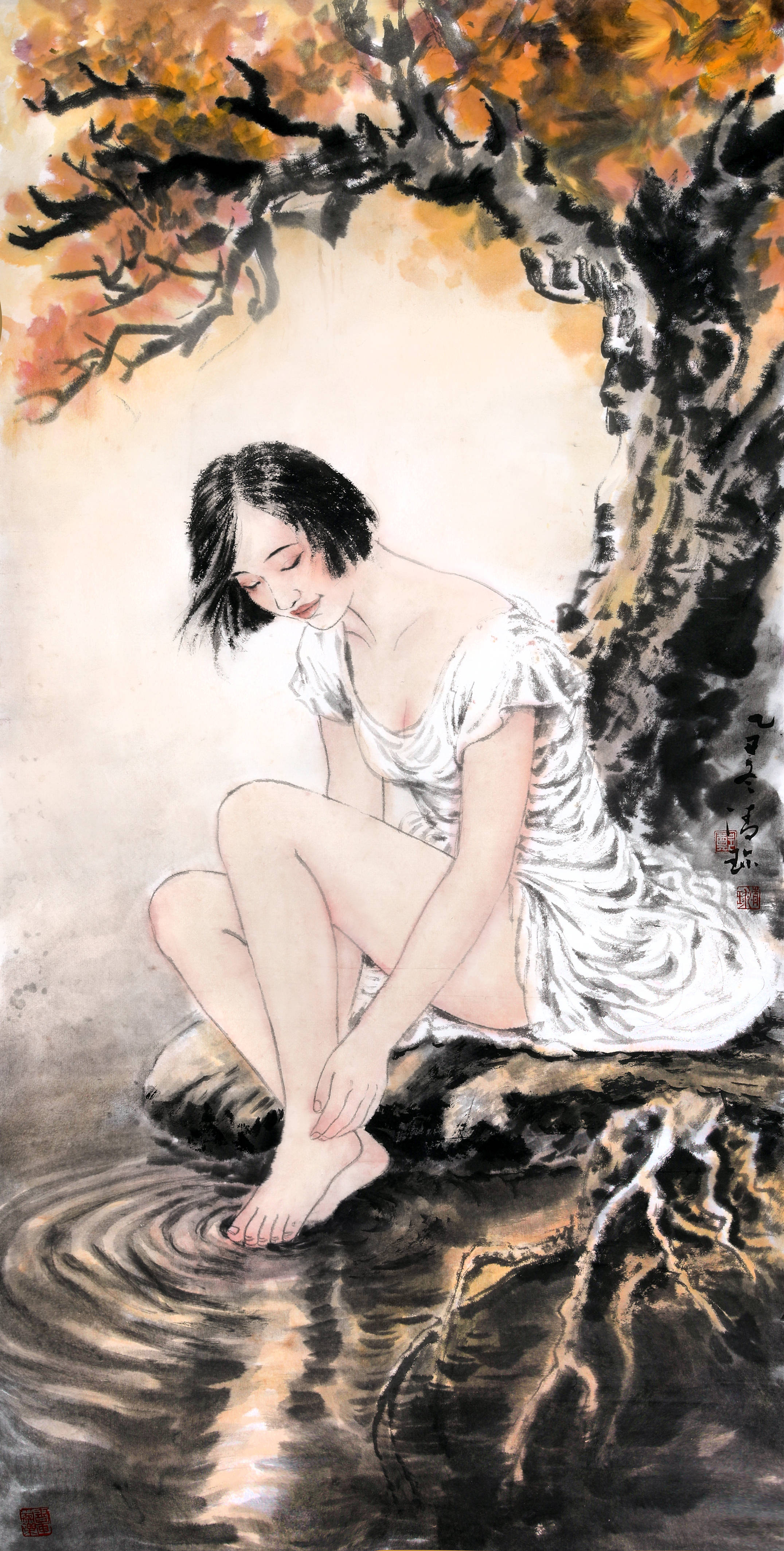 秋树下探脚戏水的姑娘,以写意笔墨裹着少女的娇憨,白裙被风掀起的弧度、垂在颈边的发丝,都透着未经雕琢的灵动,是现代少女活力的生动写照;
