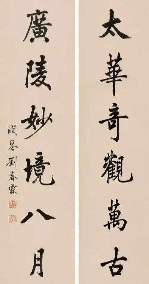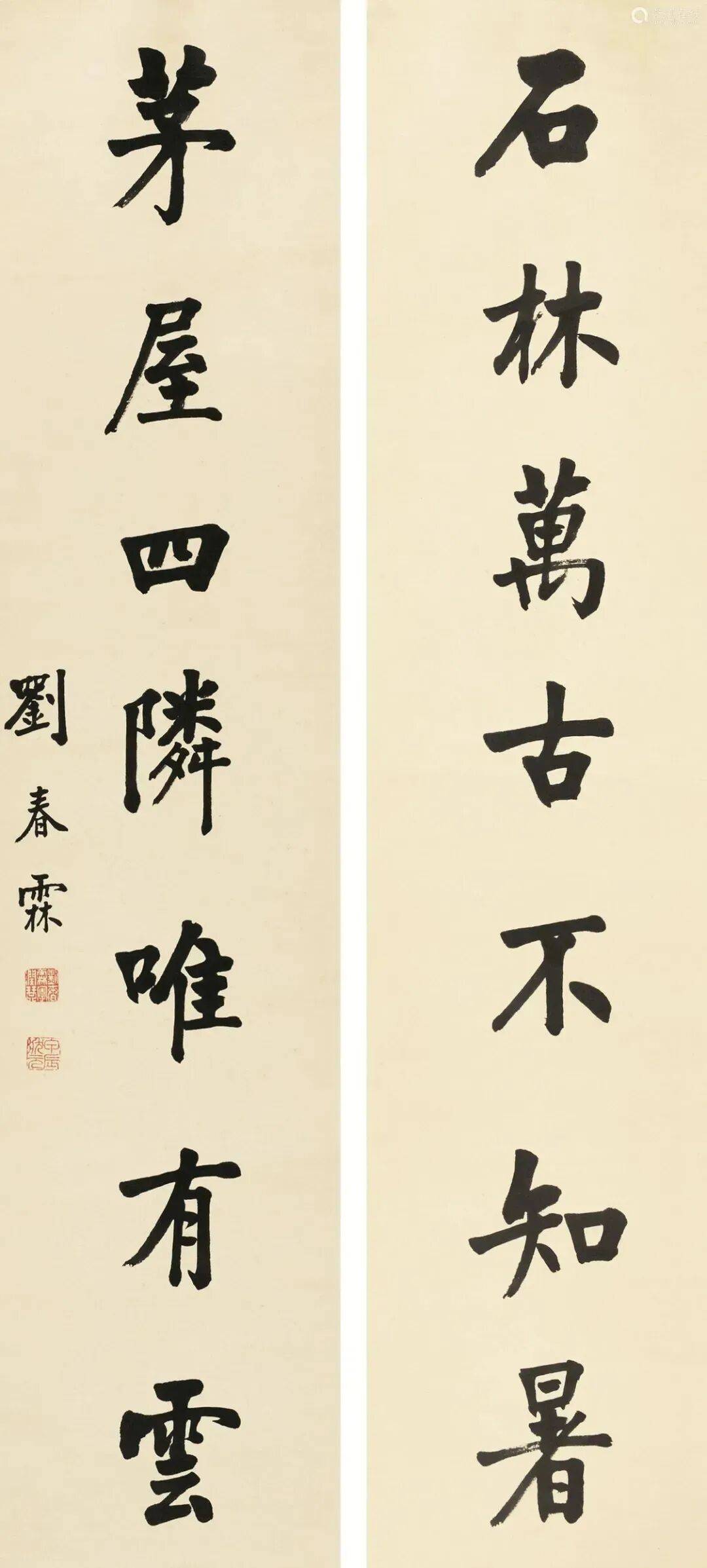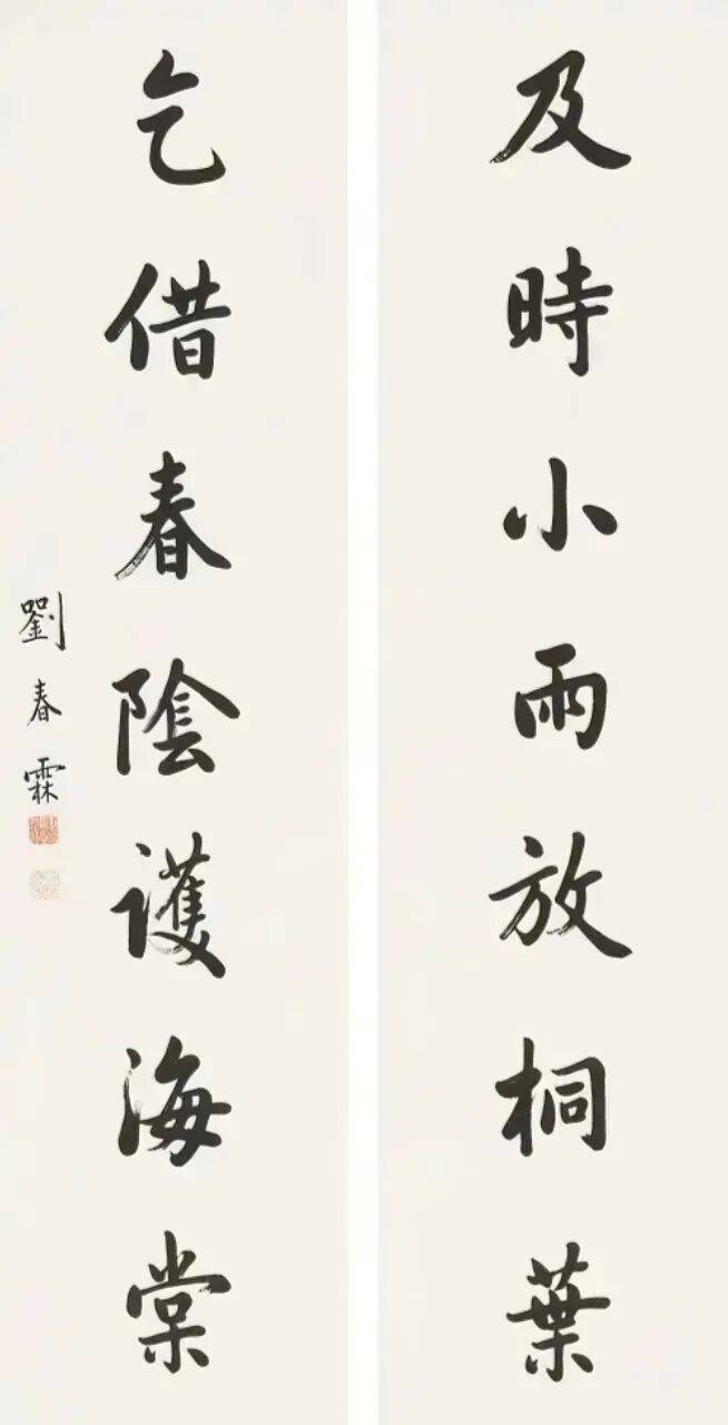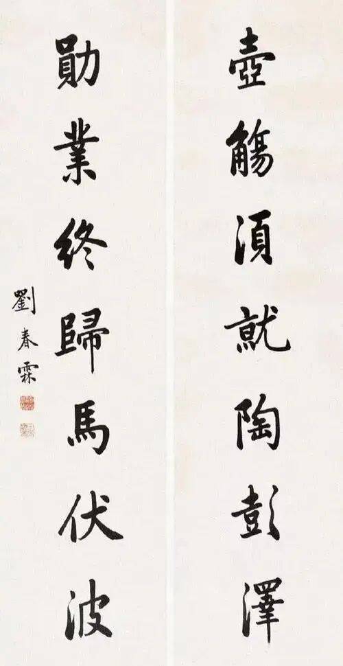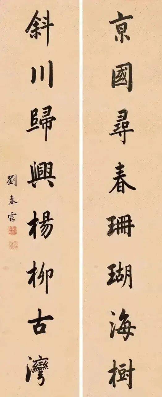 刘春霖素来以楷法冠当世闻名,其楷书兼具馆阁体的严谨端庄与文人书法的灵动气韵,笔力浑厚、力透纸背,结构规整却无刻板之态,小楷更是有“当代无双”之誉,为后世楷书典范。其行书取法二王与赵孟頫,笔墨温润、行云流水,笔画衔接自然洒脱,兼具法度与意趣;榜书亦庄重大气,笔墨沉雄,尽显大家风范。虽隶篆、草书非其主攻方向,但亦有可观之处,称其诸体皆精,核心在于楷行的登峰造极,及各体创作中始终坚守的笔墨功底,这份造诣在书法对联的创作中,更是展现得淋漓尽致。