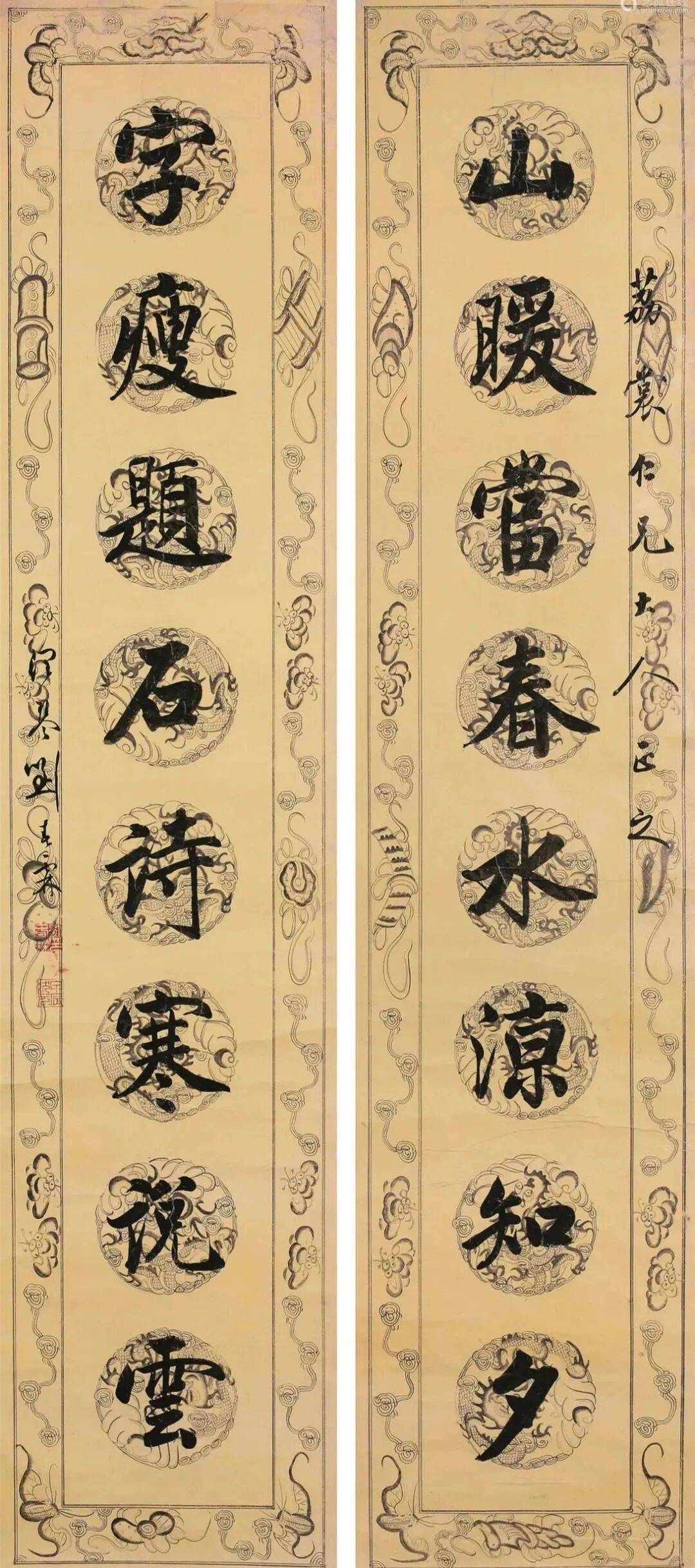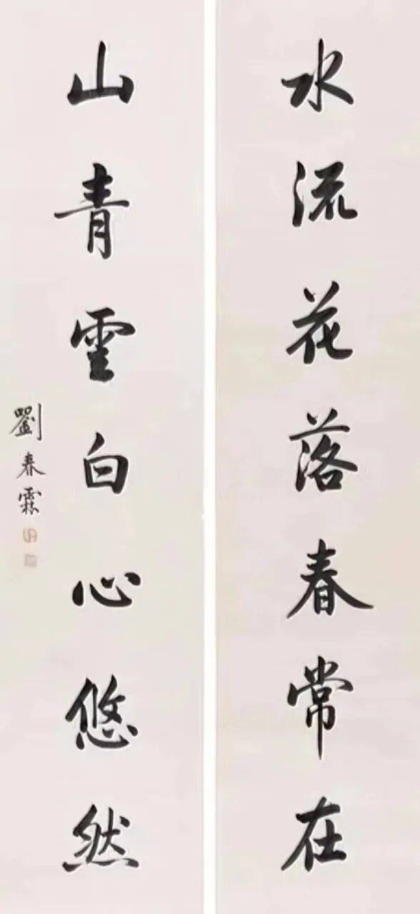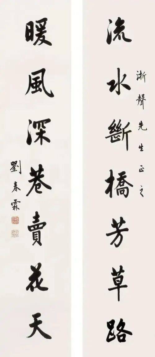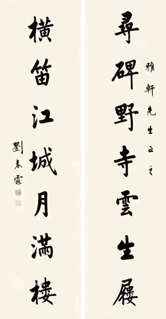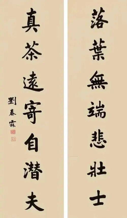 刘春霖素来以楷法冠当世闻名,其楷书兼具馆阁体的严谨端庄与文人书法的灵动气韵,笔力浑厚、力透纸背,结构规整却无刻板之态,小楷更是有“当代无双”之誉,为后世楷书典范。其行书取法二王与赵孟頫,笔墨温润、行云流水,笔画衔接自然洒脱,兼具法度与意趣;榜书亦庄重大气,笔墨沉雄,尽显大家风范。虽隶篆、草书非其主攻方向,但亦有可观之处,称其诸体皆精,核心在于楷行的登峰造极,及各体创作中始终坚守的笔墨功底,这份造诣在书法对联的创作中,更是展现得淋漓尽致。