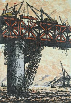 新中国成立后,“建设”成为时代主旋律。武汉长江大桥、南京长江大桥建设期间,来自全国各地的美术家们汇聚工地写生创作,诞生了一系列反映国家和社会主义建设的经典作品。诸如1954年李斛画武汉长江大桥日夜不停施工的画面《长江大桥钻探工程》、1957年武石表现大桥合龙的版画《最后一根钢梁》、1963年酆中铁创作的黑白木刻版画《大江东去》、1969年陈大羽以南京长江大桥为题创作的水墨画,无不留下深刻的历史印迹。