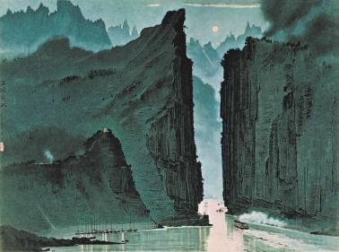 抗战时期曾经生活在重庆的画家李斛和宗其香,均于这一时期创作了以《三峡夜航》为题的巨幅画作。其中,1971年李斛创作的《三峡夜航》,描绘的是月夜下客轮驶向瞿塘峡的场景,两岸夔门崖壁耸立,在视觉上极具震撼力,远景中的崇山映照出洁白的月光,完美表现了长江的雄奇之姿。李斛作为新中国画的重要实践者,这件作品使用了大量的墨色调和青色,代表了一个时期彩墨画的成就。1977年和1980年,宗其香也分别创作了《三峡夜航》和《长江三峡夜景》。相较而言,宗其香更注重传统的笔墨意味,长江三峡江面更开阔,通过天空和江面上映射的霞光,映衬出两岸崖壁的幽深之感。