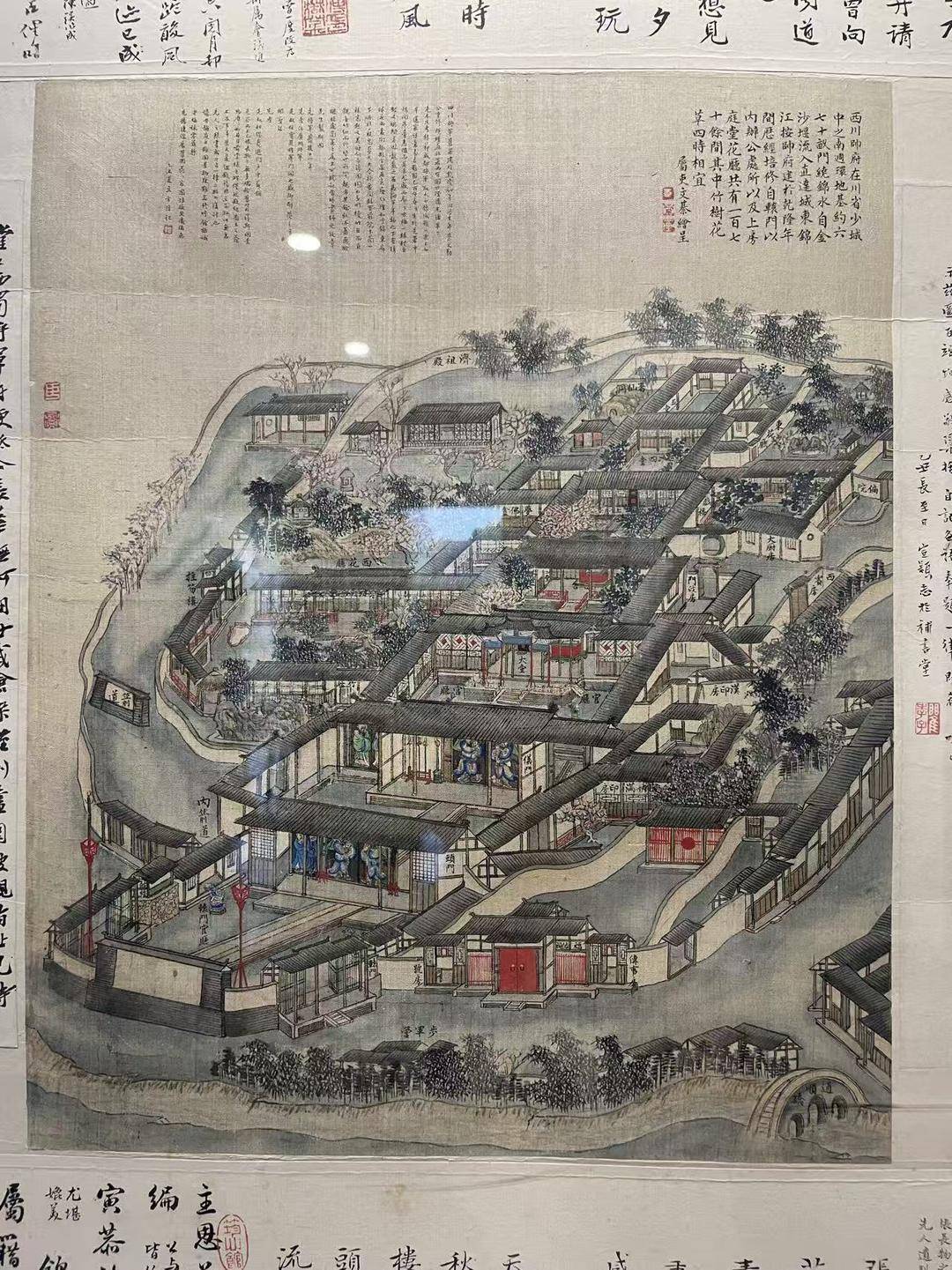 在展厅入口,另一件同样有“史料”作用的作品,来自清代文綦所绘的《西川帅府》。据介绍,《西川帅府》画作的原型是清代成都将军衙门。资料记载,成都将军衙门原址在成都长顺街口西边,将军衙门保存下来的图片很少,但我们能从《西川帅府》中一窥曾经成都将军府的壮观风貌。