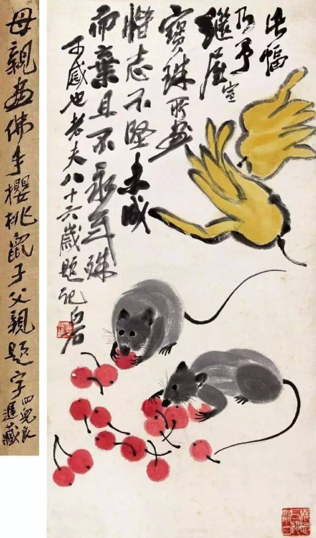 齐白石题:此幅乃予继(屋)室宝珠所画,惜志不坚,未成而弃,且不永年,殊可感也。老夫八十六岁题记,白石。钤印:白石翁、痴思长绳系日 齐良迟题签条:母亲画佛手樱桃鼠子,父亲题字。四儿良迟藏。
