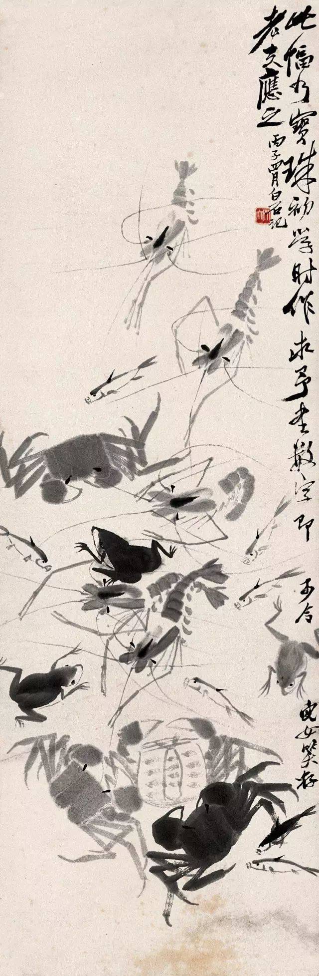 后来,胡宝珠又作了一幅群虾图,拿与丈夫品评。白石老人欣赏之余一则以喜,一则以忧喜者夫人有此成就,构图着色无不酷似自己的亲笔;忧者恐人散布流言蜚语说齐白石作画有夫人代笔,连借山馆出来的画也不可靠了。