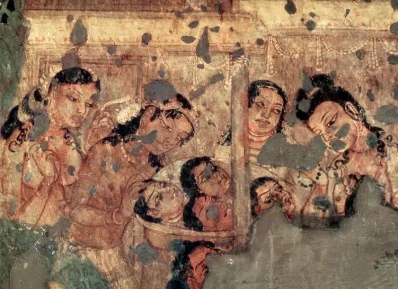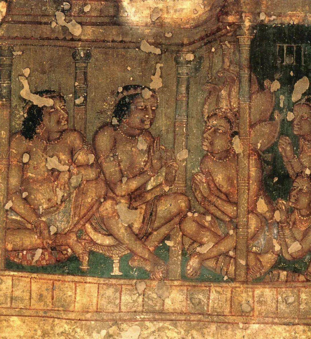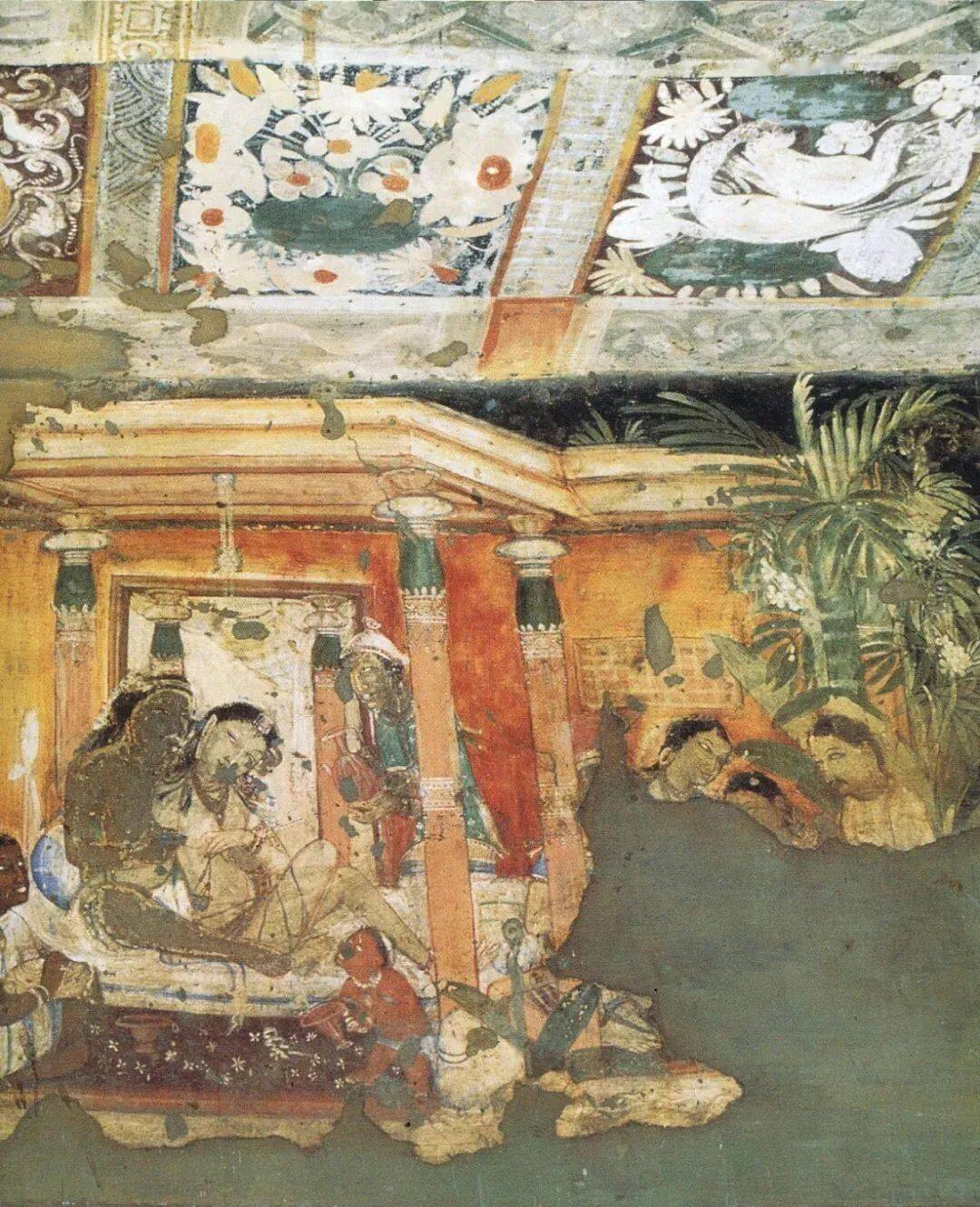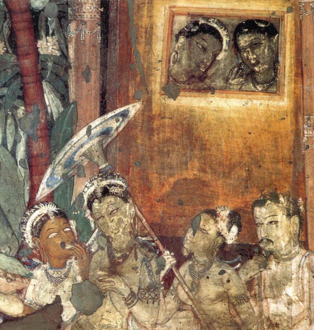 在前廊壁画的左侧场景中,可以见到各种肤色的乞丐正在祈求太子的布施,其中有绿色、棕色、黄色和灰色皮肤的人物,有些拄着拐杖,伸手做乞讨状。其中有两人打伞,伞呈方形,饶有趣味。(图21)在壁画的中央部分(窟门上方),可以看到王子的贵族生活,及其带着妻子离开皇宫的场景。画面中央,须大拏太子及其妻子相簇而坐,眉目顾盼,极富燕婉之情,被三人侍奉。(图22)这幅画面可谓阿旃陀壁画中男女爱侣像之艺术造诣最高者。画面左侧,可见王子和妻子步行离开皇宫,即将走出宫门,其身后是刻画精细的槟榔树,身旁还有侍女为其撑起华盖。(图23)妻子上方,一扇窗中有两位侍女正探头张望。画家采用了一种奇特的艺术手法,将窗户中的人物绘制成了单调的黑白色,突出了窗中光线昏暗的效果。(图24)壁画的右侧残损较为严重,可以看到帝释天及其两位随从,以及奏乐的天人正在云间观察须大拏太子的一举一动。(图25)