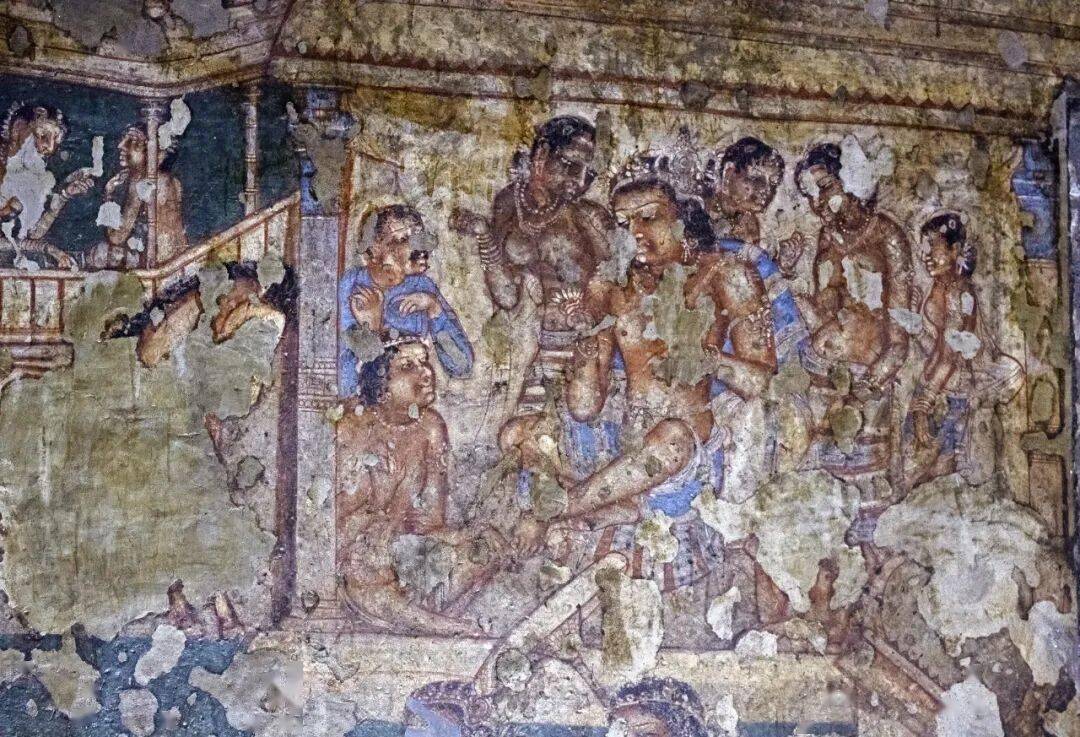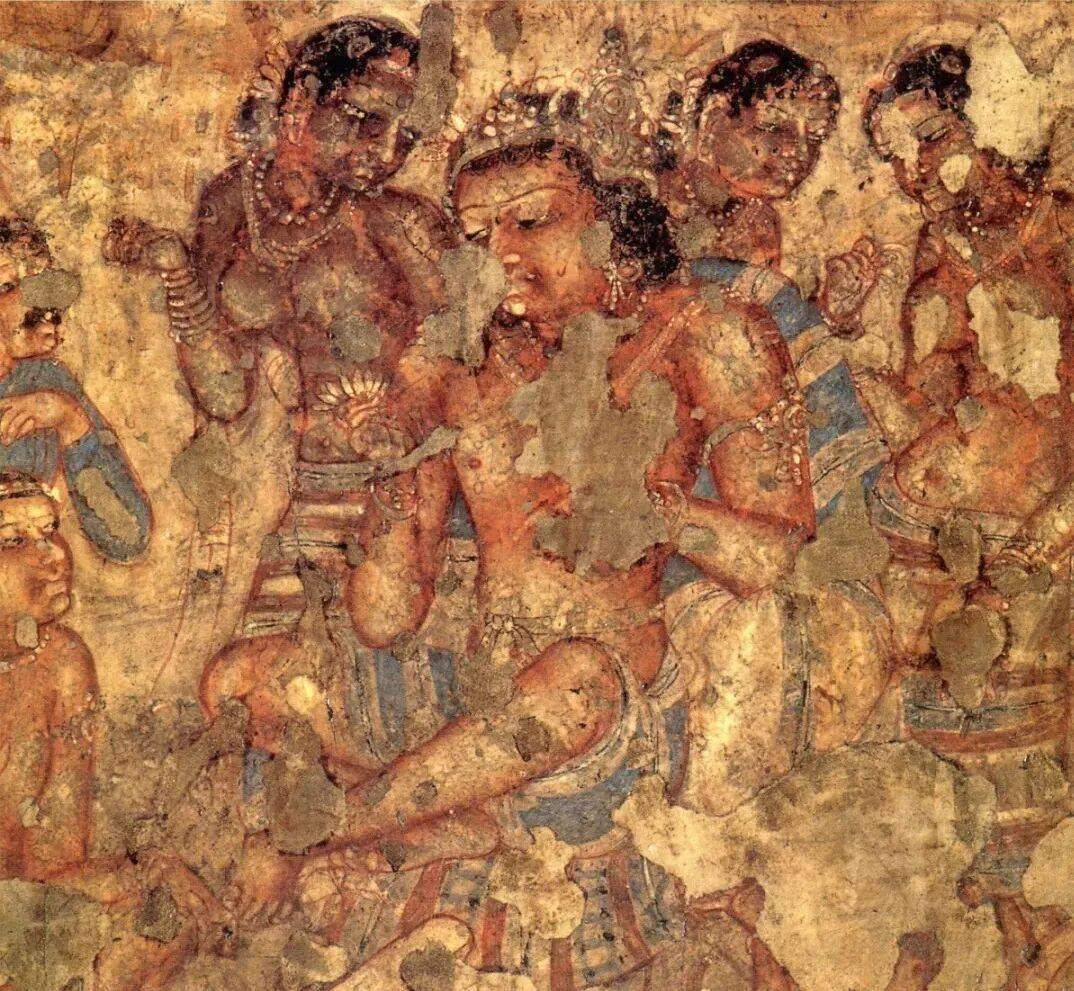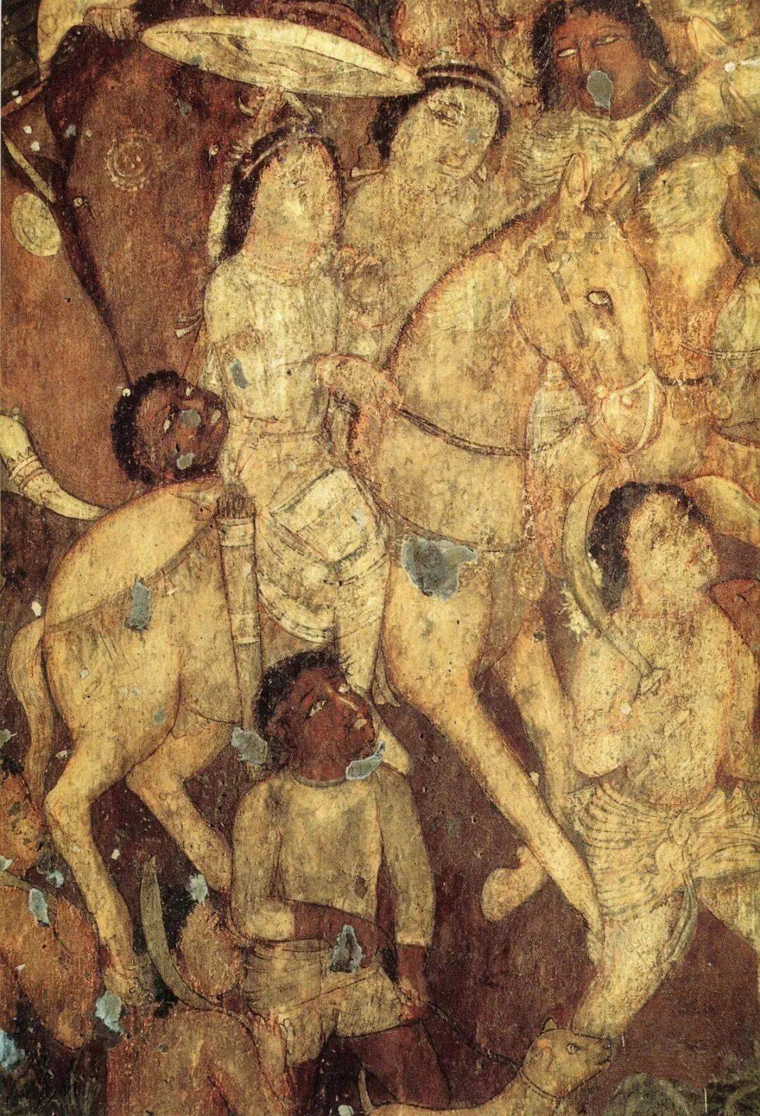 值得一提的是,阿旃陀壁画中的本生故事虽然数量多,但画家能够抓住主要人物的主要特征,对其加以区别。如在各个故事中大量出现的国王形象,就可以轻易地同普通人区分开来。国王采用标准的王者坐姿,或交脚,或倚坐,或被施以“灌顶礼”,或骑在战象上被众人簇拥,其豪华的冠饰、身上的璎珞均与常人不同。而不同故事中的重要线索,如“调服醉象”故事中的发狂大象、“狮子国因缘”故事中狞厉的海妖、“难陀出家”故事中忧郁至极的难陀、“佛祖降生”故事中三只眼睛的帝释天、“水牛本生”中强健的水牛,均能够为观者提供故事的标志性要素,为准确理解故事的内容提供了图像志的支持。
