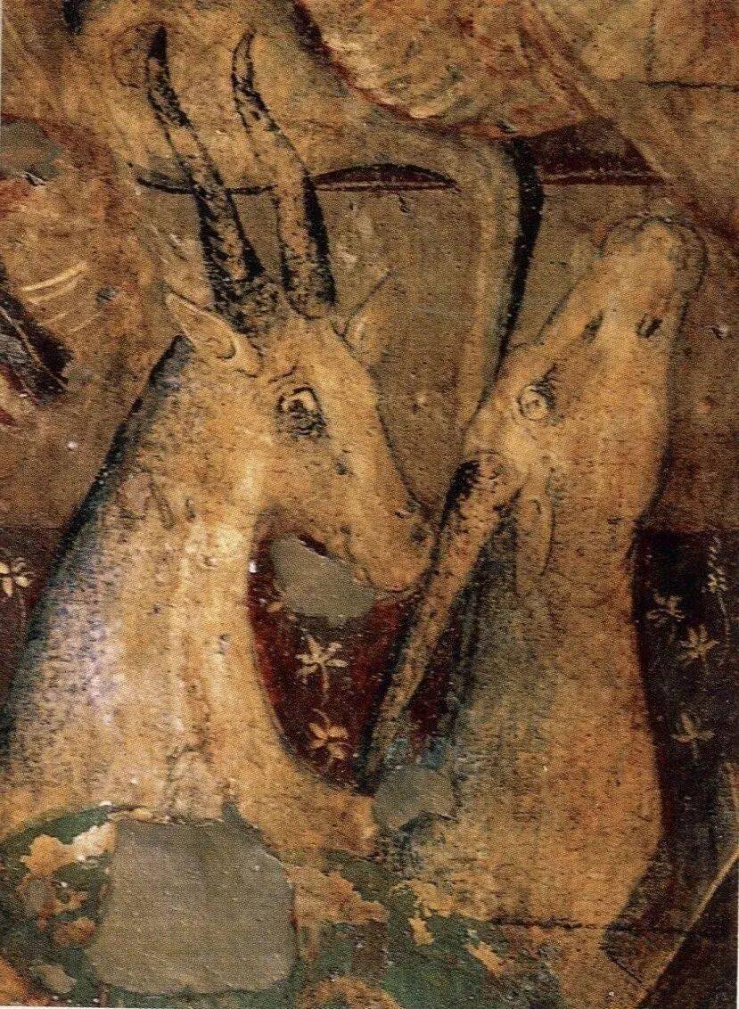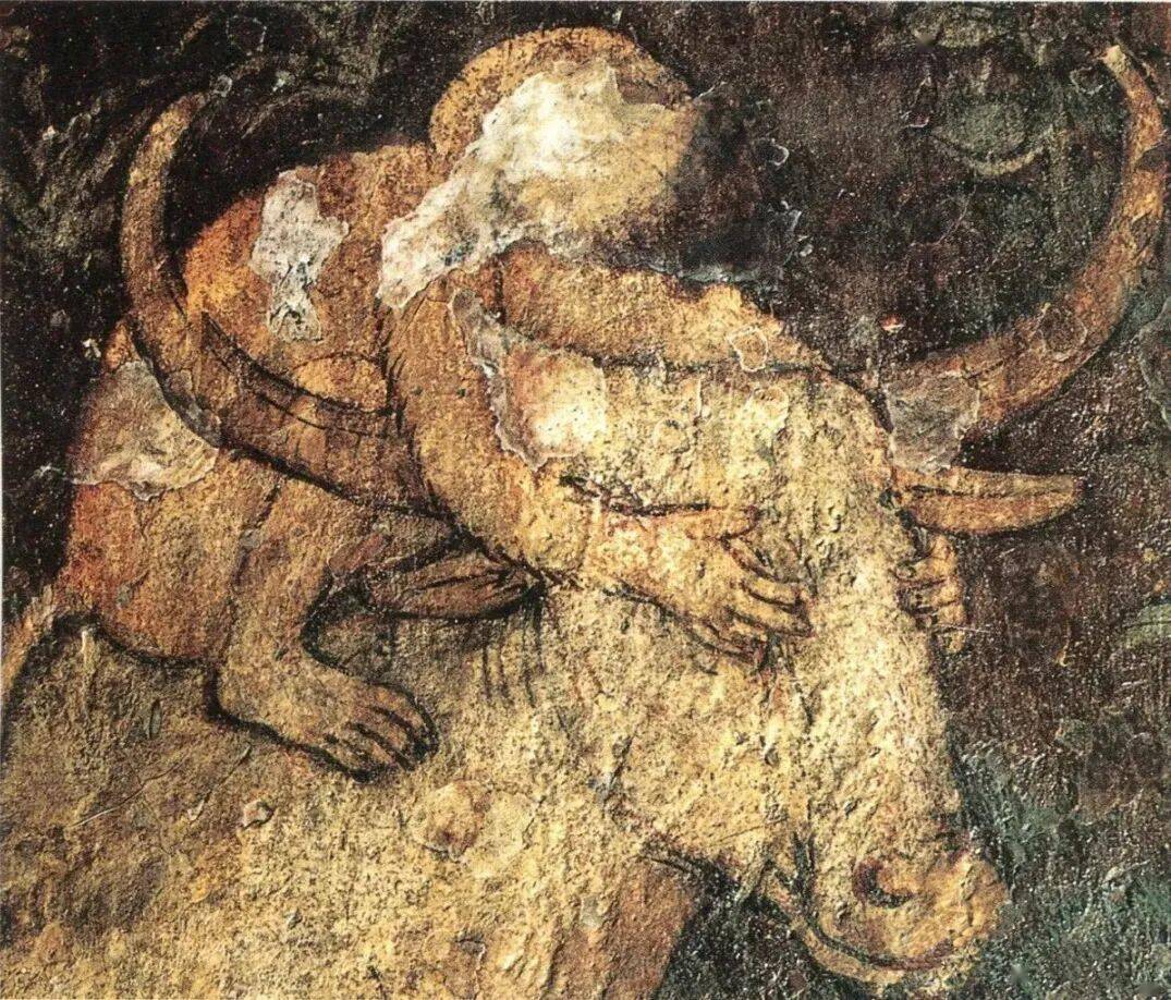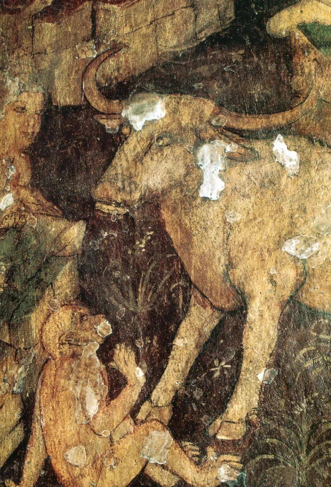 “水牛本生”故事在阿旃陀石窟中仅见于第17窟,故事讲到佛的前世是一头温顺的水牛,生活在喜马拉雅山间。一个鲁莽的猴子一直欺负水牛,而水牛却并不生气,对猴子十分容忍。有一天,另一头野牛来到了水牛曾经待过的树下,猴子误以为它是那头温顺的水牛,继续上前欺负他,结果被激怒的野牛把猴子抛向空中,不顾它的哀嚎,将其践踏而死。在壁画中,艺术家采用了两个场景来表现这一本生故事。第一个场景中,猴子骑在水牛的脖子上,双手蒙住了水牛的眼睛,水牛嘴角上扬,并不生气。(图14)第二个场景中,猴子已经被野牛抛在地上,猴子左手抓地,右手合十行礼,似乎在向野牛哀求,野牛目光如炬,似乎并不领情。山间还有一位女神微笑着看着他们。(图15)