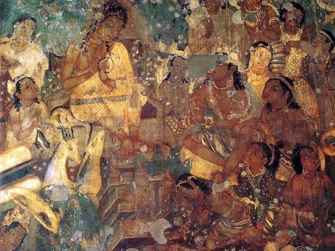 阿旃陀佛教壁画中最精华的部分当属佛教故事画。这些壁画系阿旃陀壁画中最为重要的内容,依照佛经义理可将其分为“本生故事”“譬喻故事”与“佛传故事”三类。