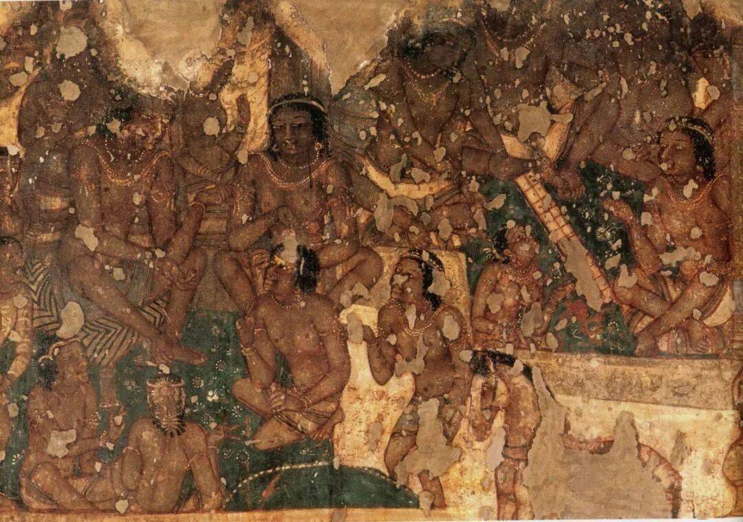 本生故事是阿旃陀石窟壁画中的重要内容。李崇峰先生指出:“本生(jātaka),音译阇陀伽,系记载佛陀生前所修种种善行,也就是释迦牟尼的前世故事。这是印度最古老、最完整的民间故事总集,经常受到佛教画家的青睐。在这些故事中,佛以菩萨身份出现,有时为凡人,有时变天神,有时作小鸟,有时成大象。每一故事都表现他竭尽全力发扬十善,反映出他那种自我牺牲、无私奉献、大慈大悲的高贵品格。这些逼真而又具非凡想象力的本生故事,曾给佛教信徒以强大的震撼;而画家采用写实主义手法敏锐地表达的现实生活,也必然会在香客和朝圣者的心目中留下难以忘怀的深刻印象……据我们不完全统计,阿旃陀石窟中现存本生故事可考订者有21种之多。”以下本文将阿旃陀石窟壁画中的本生故事图依照石窟编号论述如下: