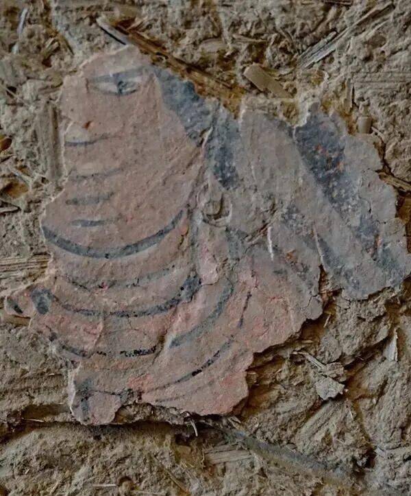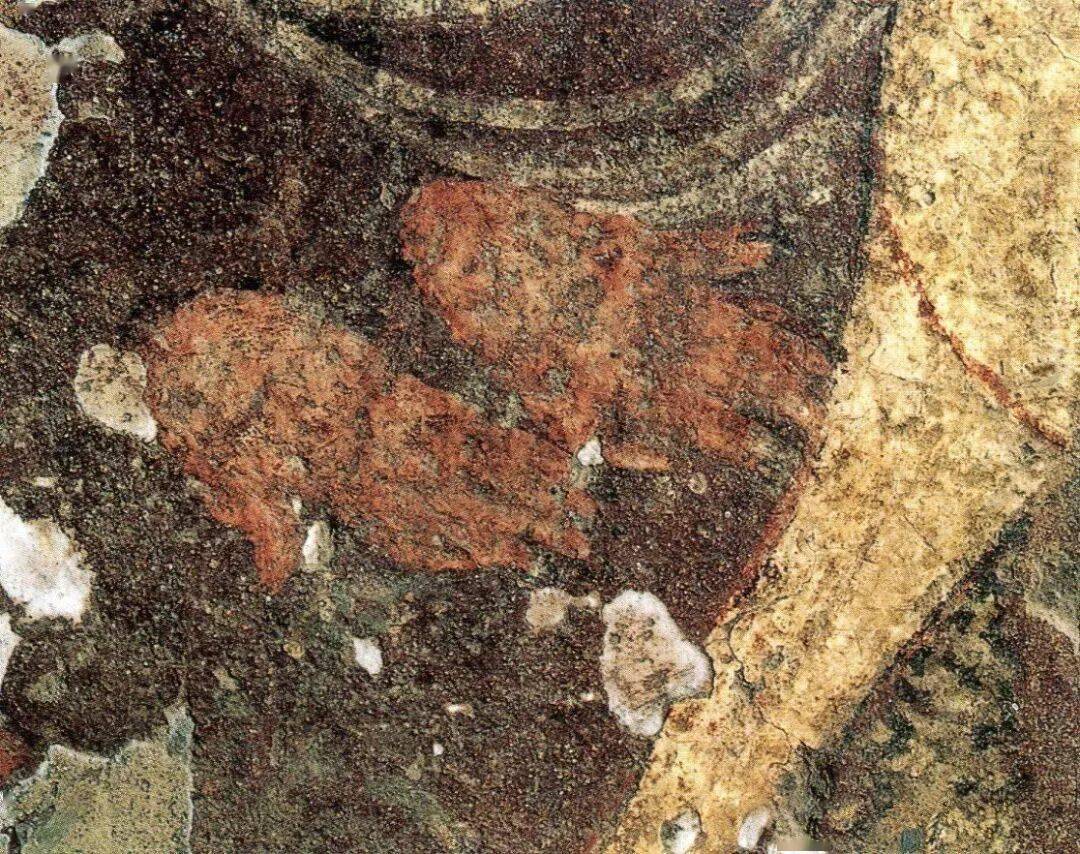 印度画家采用红色的起稿线进行勾勒,至今在一些壁画中还能见到这些起稿线。在第26窟左墙的一个不起眼的地方,还可以看到当初绘制的起稿线,(图26)仅仅留下了一些粗糙的轮廓线,可能还没有绘制完成。完成起稿之后,有时画家会用黑笔准确钩一次轮廓,有时干脆不勾线,而用稍微粗一些的红笔将线条渲染,加强了线条分界功能的质感。在人像的绘制时,在一些重点的位置,如眉毛、眼角、嘴唇处,用墨线突出,主次分明,使人物更加传神。