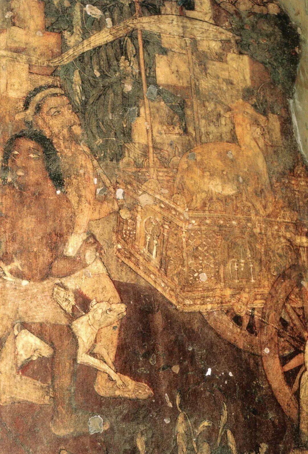 试想,古印度的佛教信众进入灰暗的阿旃陀石窟中静观壁画之时,是否与我们一样迷茫。释迦牟尼佛祖的各种神迹故事与其前世的种种“因果报应”和“乐施”“牺牲”等故事,能否被准确理解,引起信众的共鸣,是阿旃陀壁画的绘制者必须要面对的问题。为了方便理解,阿旃陀壁画中有些内容增加了榜题,用于标示主要人物的身份。“这些本生故事大多舍弃了印度早期雕刻,如珀鲁德、桑吉和阿默拉沃蒂等传统的‘上画下记’之法,但在绘制罕见题材或自由表现主题时,往往于画像之下标记主体人物名字,以利辨识。如第2窟的羼提本生和第17窟的尸毗王本生。中国古代传统绘画中亦采纳‘左榜右壁’之法,看来东方文化艺术在许多方面是相通的。”