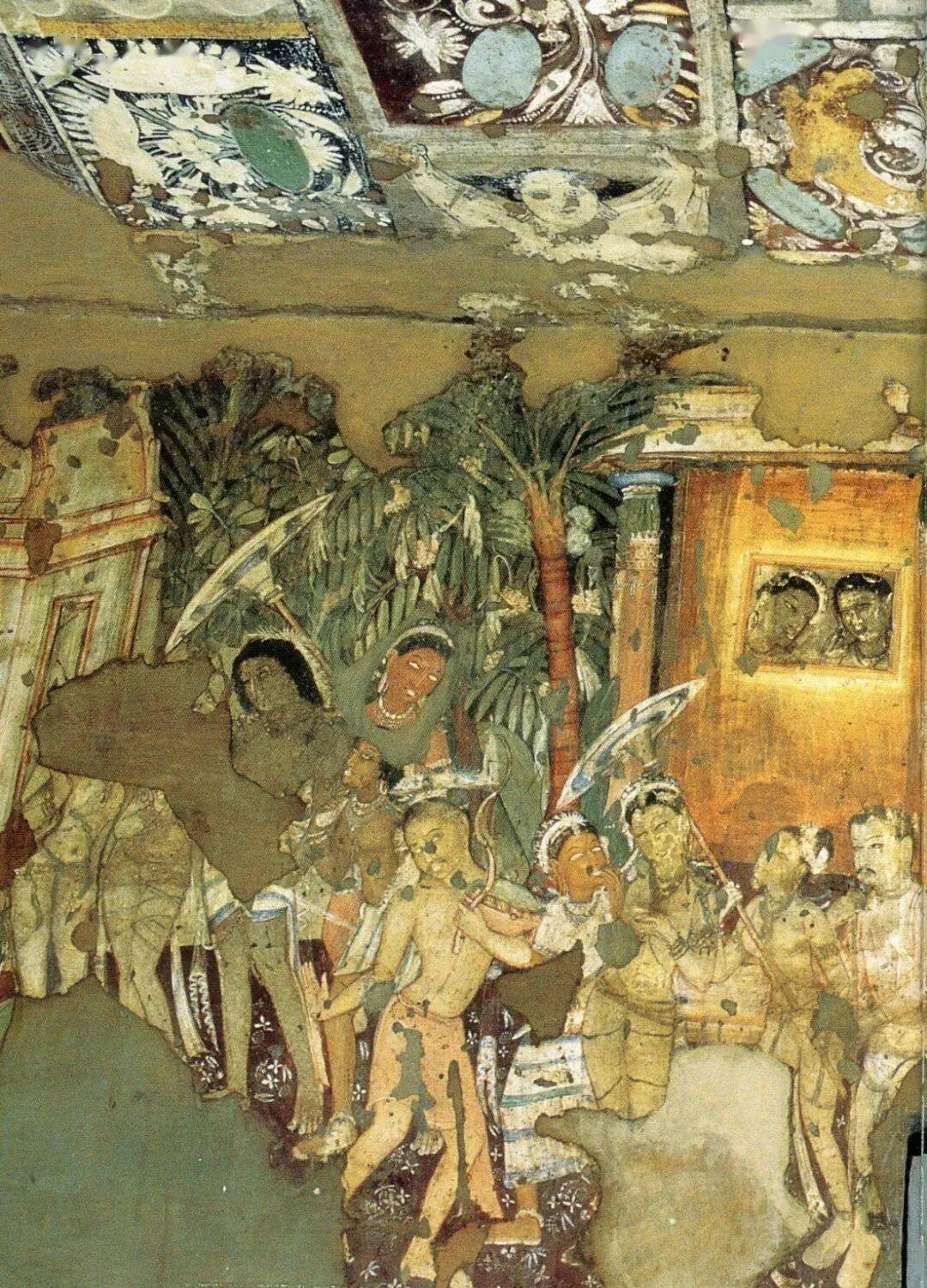 首先,从绘画内容上看,阿旃陀石窟无疑为中国早期(北朝)石窟寺中的佛教故事,尤其是本生故事提供了参考和样本。敦煌壁画中的“九色鹿王本生”“尸毗王本生”“降魔成道”“舍卫城神变”等故事,克孜尔壁画中的“兜率天说法”“猴王本生”“鬼子母失子缘”“须摩提女请佛缘”等故事,斯坦因盗掘的古鄯善(楼兰)米兰佛寺遗址中的“须大拏本生”故事、云冈石窟中的“罗睺罗受记”等内容均同阿旃陀壁画中的佛教故事内容重合。虽然在表现技法、构图和艺术形式上存在较大差距,但这些故事来自相同的佛经,经由在丝绸之路往返的胡僧翻译到中国,并进入了艺术领域,成为向信众传播佛教教义的图像载体。
