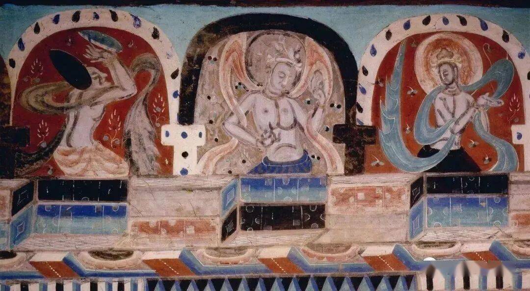 此外,颜色中由于含铅,随着时间的推移,颜色会铅化变色。含铅的白与银朱混合后,由于氧化而致使肤色变黑。西魏《天宫伎乐》,人物的肤色由于氧化而发生明显的变色。肤色氧化变黑后和模糊的轮廓线融在一起显得更为整体,并与白底形成黑与白、明与暗强烈的对比,使人物的动感甚为强烈。另外,敦煌壁画很注重色彩的黑与白、重和轻的调节作用。榆林窟第3窟之“普贤”变,纯以黑线完成,略敷淡彩,背景为水墨山水,以白色为底色,线的组织形成灰调子,这样,就有黑白灰的节奏美感。在经变故事画中较亮的色彩上,会压上一个很重的色彩方块,在色块之上题上说明文字,解释画面所表达的主题或主要意思。这个色块不但有装饰的作用,也有平衡画面的作用。