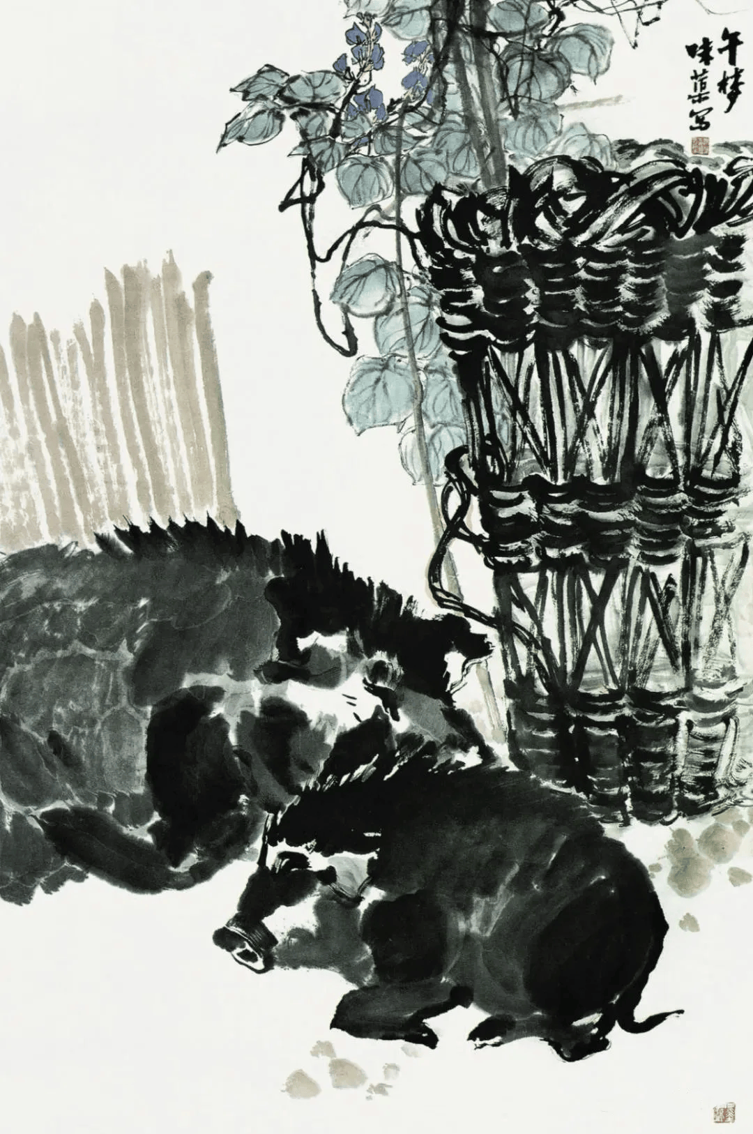 我的画竹,即始于此,并开始自己种竹。这是一种生长不会很高的所谓“罗汉竹”,从出笋、成长以及浇水多少的种种变化,都有所了解,深入观察其生长生活规律。我的画竹,不是一般画家所专门一科的画竹,在我的画中,是当草来用的。主要是从现实中来,虽有规律,但运用得比较随便。