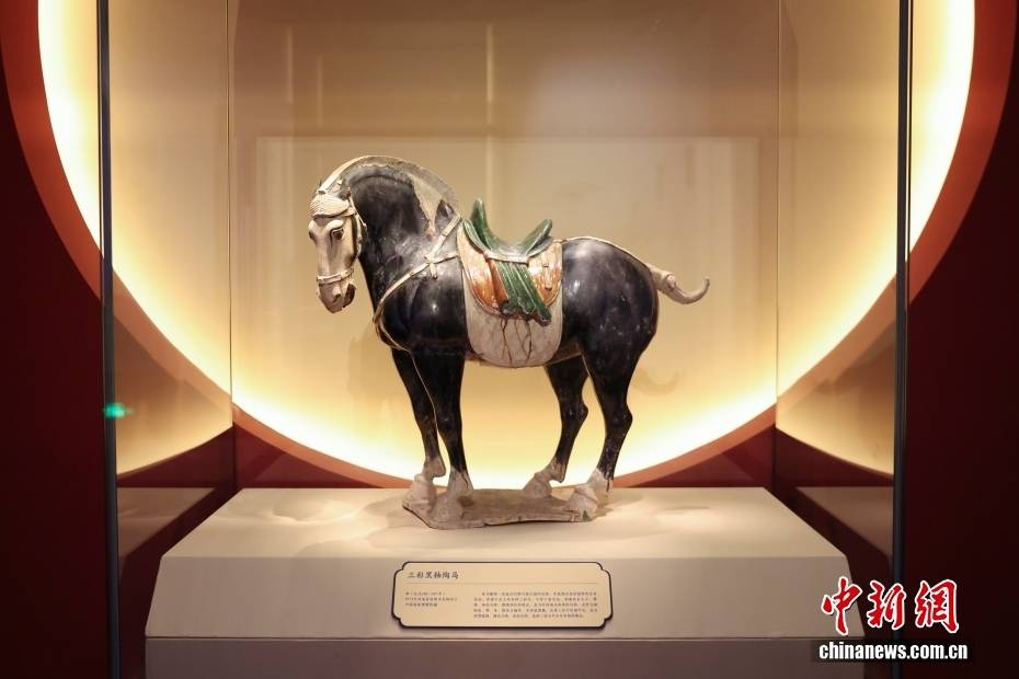 1月29日,“跃马扬鞭——马年新春文化展”在北京中国国家博物馆开幕。展览遴选与马相关的精品文物120余件/套,全方位、多角度展示出马在中华文明长卷中的千姿百态,生动阐释马在中华文化中的深厚内涵和时代价值。图为三彩黑釉陶马。中新社记者 王紫儒 摄