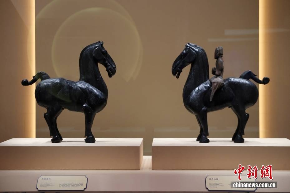 1月29日,“跃马扬鞭——马年新春文化展”在北京中国国家博物馆开幕。展览遴选与马相关的精品文物120余件/套,全方位、多角度展示出马在中华文明长卷中的千姿百态,生动阐释马在中华文化中的深厚内涵和时代价值。图为木胎漆马(左)和骑马木俑。中新社记者 王紫儒 摄