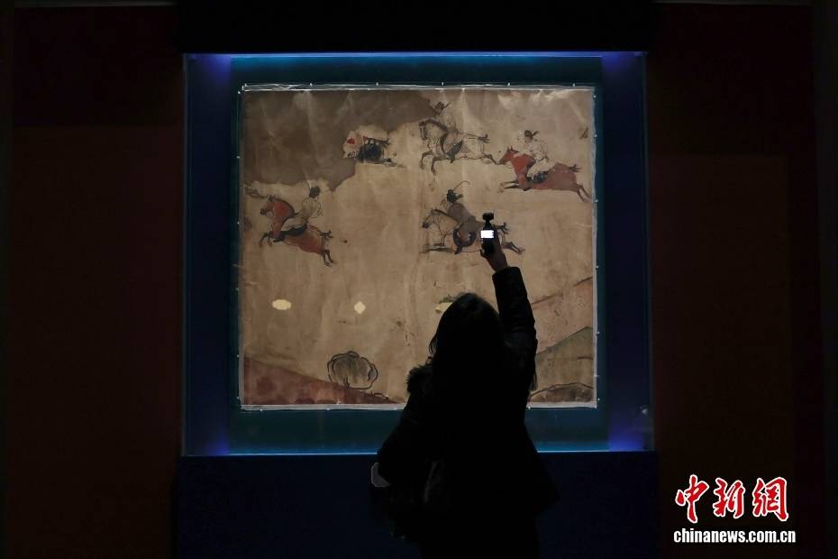 1月29日,“跃马扬鞭——马年新春文化展”在北京中国国家博物馆开幕。展览遴选与马相关的精品文物120余件/套,全方位、多角度展示出马在中华文明长卷中的千姿百态,生动阐释马在中华文化中的深厚内涵和时代价值。图为参观者拍摄打马球图(壁画临摹图)。中新社记者 王紫儒 摄