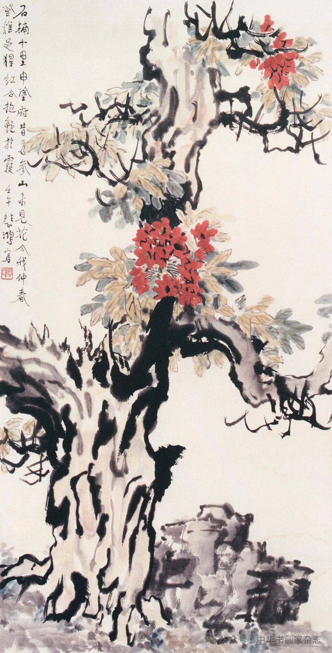 款识:石楠十里申涂府,昔为参山未见花。今我仲春登鸡足,猩红合抱艳于霞。壬午,悲鸿写。