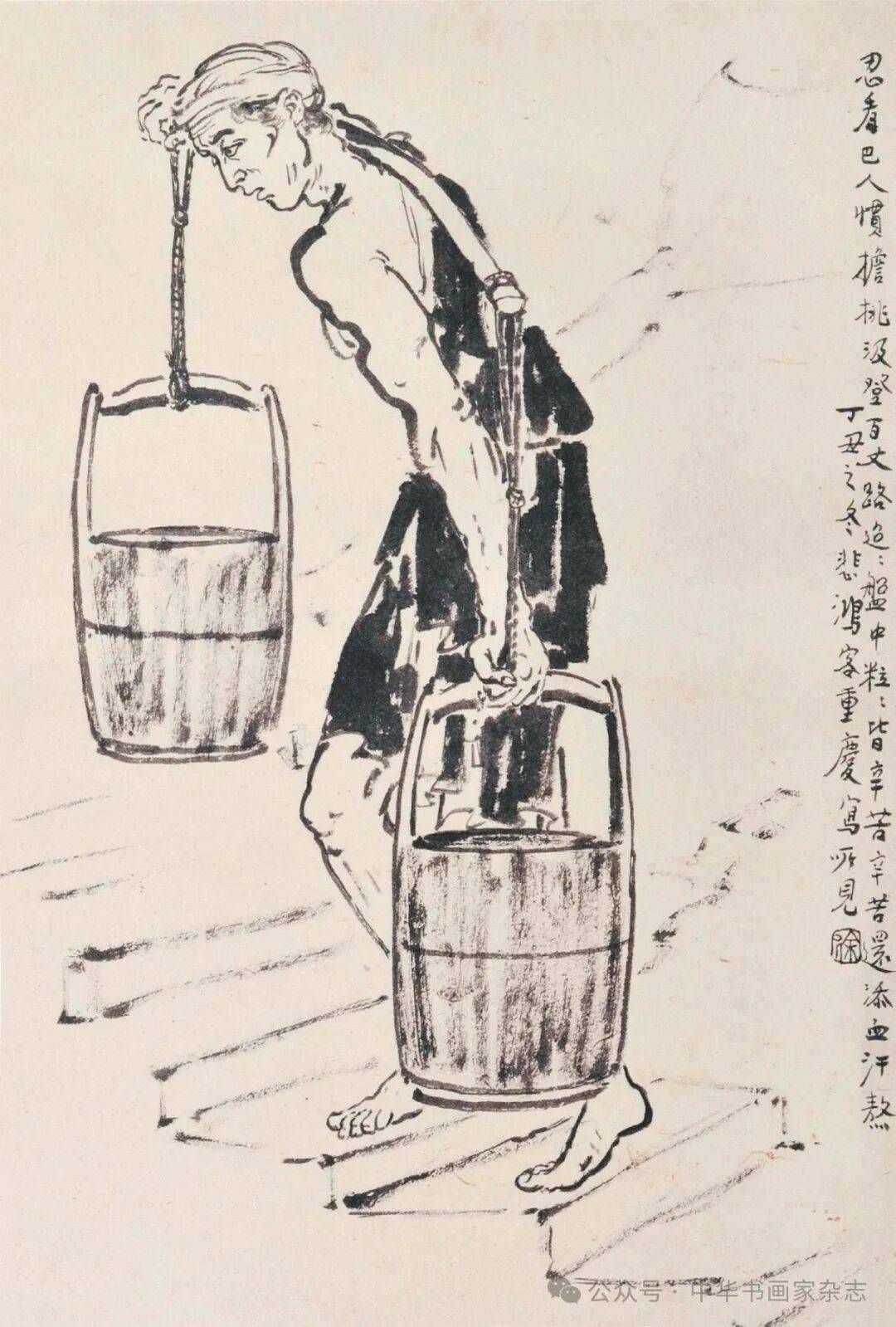 款识:忍看巴人惯担挑,汲登百丈路迢迢。盘中粒粒皆辛苦,辛苦还添血汗熬。丁丑之冬,悲鸿客重庆写所见。